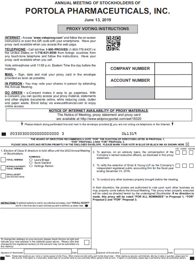 THE BOARD OF DIRECTORS RECOMMENDS A VOTE “FOR” THE ELECTION OF DIRECTORS LISTED IN PROPOSAL 1, “FOR” PROPOSAL 2, “FOR” PROPOSAL 3 AND “FOR” PROPOSAL 4. PLEASE SIGN, DATE AND RETURN PROMPTLY IN THE ENCLOSED ENVELOPE. PLEASE MARK YOUR VOTE IN BLUE OR BLACK INK AS SHOWN HERE Signature of Stockholder Date: Signature of Stockholder Date: Note: Please sign exactly as your name or names appear on this Proxy. When shares are held jointly, each holder should sign. When signing as executor, administrator, attorney, trustee or guardian, please give full title as such. If the signer is a corporation, please sign full corporate name by duly authorized officer, giving full title as such. If signer is a partnership, please sign in partnership name by authorized person. To change the address on your account, please check the box at right and indicate your new address in the address space above. Please note that changes to the registered name(s) on the account may not be submitted via this method. INSTRUCTIONS: To withhold authority to vote for any individual nominee(s), mark “FOR ALL EXCEPT” and fill in the circle next to each nominee you wish to withhold, as shown here: JOHN SMITH 1234 MAIN STREET APT. 203 NEW YORK, NY 10038 Please detach along perforated line and mail in the envelope provided IF you are not voting via telephone or the Internet. x COMPANY NUMBER ACCOUNT NUMBER NOTICE OF INTERNET AVAILABILITY OF PROXY MATERIALS: The Notice of Meeting, proxy statement and proxy card are available at http://www.astproxyportal.com/ast/18320 1. Election of Class II directors to hold office until the 2021 Annual Meeting of Stockholders: O Dennis Fenton, Ph.D. O Charles Homcy, M.D. O David C. Stump, M.D. 2. To approve an amendment to the Company’s Amended and Restated Certificate of Incorporation, as amended, to increase the authorized number of shares of common stock from 100,000,000 to 150,000,000 shares. 3. To approve, on an advisory basis, the compensation of the Company’s named executive officers, as disclosed in this proxy statement. 4. To ratify the selection of Ernst & Young LLP as the Company’s independent registered public accounting firm for the fiscal year ending December 31, 2018. 5. To conduct any other business properly brought before the meeting. In their discretion, the proxies are authorized to vote upon such other business as may properly come before the Annual Meeting. This proxy when properly executed will be voted as directed herein by the undersigned Stockholder. If no direction is made, this proxy will be voted “FOR ALL NOMINEES” in Proposal 1, “FOR” Proposal 2, “FOR” Proposal 3 and “FOR” Proposal 4. FOR ALL NOMINEES WITHHOLD AUTHORITY FOR ALL NOMINEES FOR ALL EXCEPT (See instructions below) NOMINEES: 20330303000000000000 7 060818 INTERNET - Access “www.voteproxy.com” and follow the on-screen instructions or scan the QR code with your smartphone. Have your proxy card available when you access the web page. TELEPHONE - Call toll-free 1-800-PROXIES (1-800-776-9437) in the United States or 1-718-921-8500 from foreign countries from any touch-tone telephone and follow the instructions. Have your proxy card available when you call. Vote online/phone until 11:59 p.m. Eastern Time the day before the meeting. MAIL - Sign, date and mail your proxy card in the envelope provided as soon as possible. IN PERSON - You may vote your shares in person by attending the Annual Meeting. GO GREEN - e-Consent makes it easy to go paperless. With e-Consent, you can quickly access your proxy material, statements and other eligible documents online, while reducing costs, clutter and paper waste. Enroll today via www.astfinancial.com to enjoy online access. PROXY VOTING INSTRUCTIONS ANNUAL MEETING OF STOCKHOLDERS OF PORTOLA PHARMACEUTICALS, INC. June 8, 2018 FOR AGAINST ABSTAIN