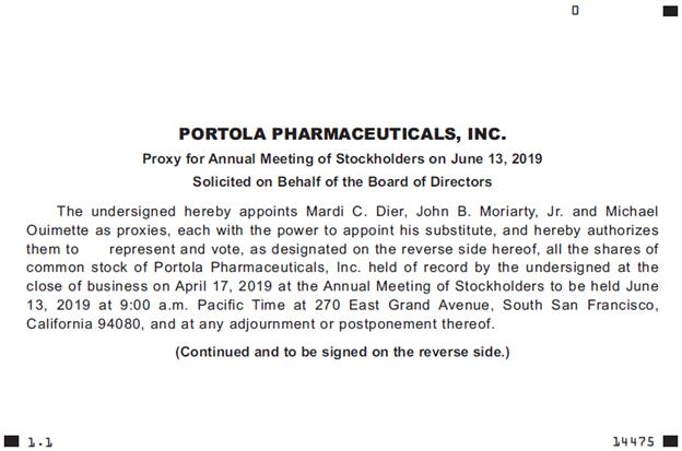 PORTOLA PHARMACEUTICALS, INC. Proxy for Annual Meeting of Stockholders on June 8, 2018 Solicited on Behalf of the Board of Directors The undersigned hereby appoints William Lis, Mardi C. Dier and Michael Ouimette as proxies, each with the power to appoint his substitute, and hereby authorizes them to represent and vote, as designated on the reverse side hereof, all the shares of common stock of Portola Pharmaceuticals, Inc. held of record by the undersigned at the close of business on April 12, 2018 at the Annual Meeting of Stockholders to be held June 8, 2018 at 9:00 a.m. Pacific Time at 270 East Grand Avenue, South San Francisco, California 94080, and at any adjournment or postponement thereof. (Continued and to be signed on the reverse side.) 1.1 14475 0