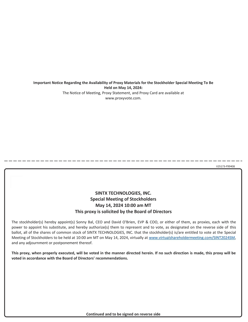 Notice is hereby given that a Special Meeting of Stockholders (the “Special Meeting”) of SINTX Technologies, Inc., Inc., a Delaware corporation (the “Company”), will be held on Wednesday, May 14, 2024 at 10:00 a.m., Mountain Time. We have adopted a virtual format for our Special Meeting to provide a consistent and convenient experience to all stockholders regardless of location. You may attend the Special Meeting virtually via the Internet at www.virtualshareholdermeeting.com/SINTX2024SM, where you will be able to vote electronically and submit questions. You may also attend the Special Meeting and submit your vote by proxy ahead of the Special Meeting through the designated website. For further information, please see the Questions and Answers about the Special Meeting beginning on the first page of the accompanying Proxy Statement. The purposes of the Special Meeting are as follows: