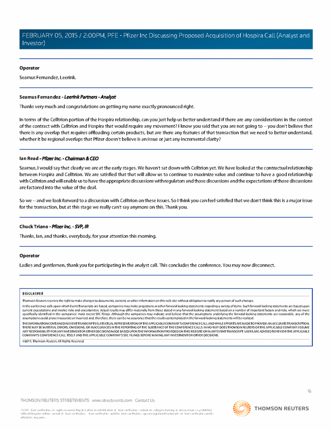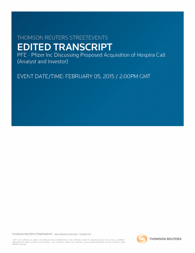 | FEBRUARY 05, 2015 / 2:00PM, PFE - Pfizer Inc Discussing Proposed Acquisition of Hospira Call (Analyst and Investor) Operator Seamus Fernandez, Leerink. Seamus Fernandez - Leerink Partners - Analyst Thanks very much and congratulations on getting my name exactly pronounced right. In terms of the Celltrion portion of the Hospira relationship, can you just help us better understand if there are any considerations in the context of the contract with Celltrion and Hospira that would require any movement? I know you said that you are not going to — you don’t believe that there is any overlap that requires offloading certain products, but are there any features of that transaction that we need to better understand, whether it be regional overlaps that Pfizer doesn’t believe is an issue or just any incremental clarity? Ian Read - Pfizer Inc. - Chairman & CEO Seamus, I would say that clearly we are at the early stages. We haven’t sat down with Celltrion yet. We have looked at the contractual relationship between Hospira and Celltrion. We are satisfied that that will allow us to continue to maximize value and continue to have a good relationship with Celltrion and will enable us to have the appropriate discussions with regulators and those discussions and the expectations of those discussions are factored into the value of the deal. So we — and we look forward to a discussion with Celltrion on these issues. So I think you can feel satisfied that we don’t think this is a major issue for the transaction, but at this stage we really can’t say anymore on this. Thank you. Chuck Triano - Pfizer Inc. - SVP, IR Thanks, Ian, and thanks, everybody, for your attention this morning. Operator Ladies and gentlemen, thank you for participating in the analyst call. This concludes the conference. You may now disconnect. DISCLAIMER Thomson Reuters reserves the right to make changes to documents, content, or other information on this web site without obligation to notify any person of such changes. In the conference calls upon which Event Transcripts are based, companies may make projections or other forward-looking statements regarding a variety of items. Such forward-looking statements are based upon current expectations and involve risks and uncertainties. Actual results may differ materially from those stated in any forward-looking statement based on a number of important factors and risks, which are more specifically identified in the companies’ most recent SEC filings. Although the companies may indicate and believe that the assumptions underlying the forward-looking statements are reasonable, any of the assumptions could prove inaccurate or incorrect and, therefore, there can be no assurance that the results contemplated in the forward-looking statements will be realized. THE INFORMATION CONTAINED IN EVENT TRANSCRIPTS IS A TEXTUAL REPRESENTATION OF THE APPLICABLE COMPANY’S CONFERENCE CALL AND WHILE EFFORTS ARE MADE TO PROVIDE AN ACCURATE TRANSCRIPTION, THERE MAY BE MATERIAL ERRORS, OMISSIONS, OR INACCURACIES IN THE REPORTING OF THE SUBSTANCE OF THE CONFERENCE CALLS. IN NO WAY DOES THOMSON REUTERS OR THE APPLICABLE COMPANY ASSUME ANY RESPONSIBILITY FOR ANY INVESTMENT OR OTHER DECISIONS MADE BASED UPON THE INFORMATION PROVIDE DON THIS WEBSITE OR IN ANY EVENT TRANSCRIPT. USERS ARE ADVISED TO REVIEW THE APPLICABLE COMPANY’S CONFERENCE CALL ITSELF AND THE APPLICABLE COMPANY’S SEC FILINGS BEFORE MAKING ANY INVESTMENT OR OTHER DECISIONS. ©2015, Thomson Reuters. All Rights Reserved. THOMSON REUTERS STREETEVENTS | www.streetevents.com | Contact Us c2015 Thomson Reuters. All rights reserved. Republication or redistribution of Thomson Reuters content, including by framing or similar means, is prohibited without the prior written consent of Thomson Reuters. ‘Thomson Reuters’ and the Thomson Reuters logo are registered trademarks of Thomson Reuters and its affiliated companies. |