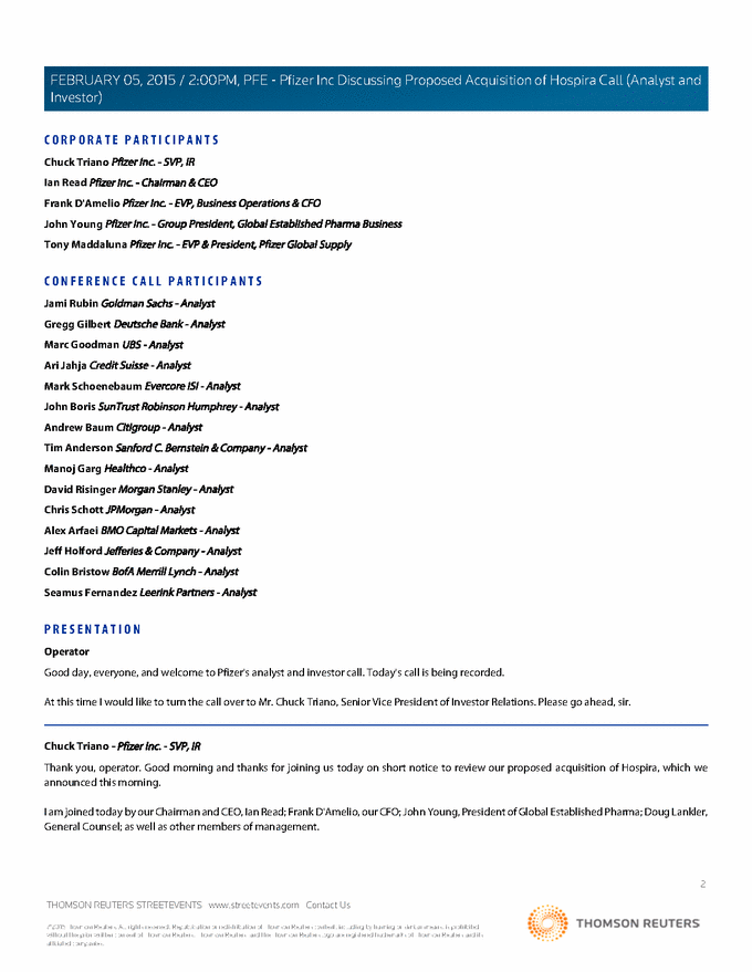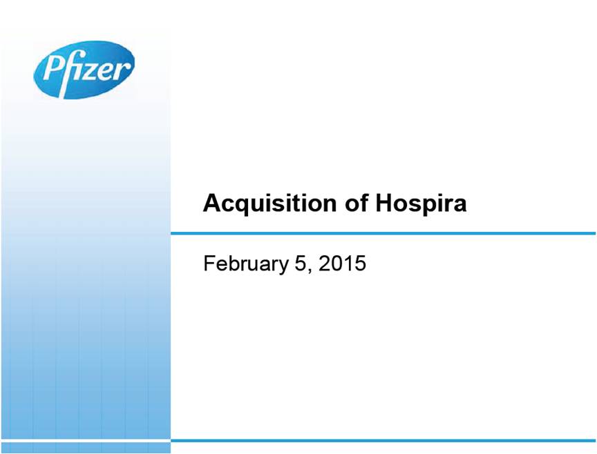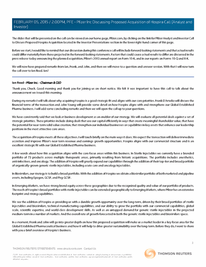| FEBRUARY 05, 2015 / 2:00PM, PFE - Pfizer Inc Discussing Proposed Acquisition of Hospira Call (Analyst and Investor) CORPORATE PARTICIPANTS Chuck Triano Pfizer Inc. -SVP, IR Ian Read Pfizer Inc. - Chairman & CEO Frank D’Amelio Pfizer Inc. - EVP, Business Operations & CFO John Young Pfizer Inc. - Group President, Global Established Pharma Business Tony Maddaluna Pfizer Inc. - EVP & President, Pfizer Global Supply CONFERENCE CALL PARTICIPANTS Jami Rubin Goldman Sachs - Analyst Gregg Gilbert Deutsche Bank-Analyst Marc Goodman UBS-Analyst Ari Jahja Credit Suisse - Analyst Mark Schoenebaum Evercore ISI - Analyst John Boris SunTrust Robinson Humphrey - Analyst Andrew Baum Citigroup - Analyst Tim Anderson Sanford C. Bernstein & Company - Analyst Manoj Garg Healthco - Analyst David Risinger Morgan Stanley - Analyst Chris Schott JPMorgan - Analyst Alex Arfaei BMO Capital Markets - Analyst Jeff Holford Jefferies & Company - Analyst Colin Bristow BofA Merrill Lynch - Analyst Seamus Fernandez Leerink Partners -Analyst PRESENTATION Operator Good day, everyone, and welcome to Pfizer’s analyst and investor call. Today’s call is being recorded. At this time I would like to turn the call over to Mr. Chuck Triano, Senior Vice President of Investor Relations. Please go ahead, sir. Chuck Triano - Pfizer Inc. - SVP, IR Thank you, operator. Good morning and thanks for joining us today on short notice to review our proposed acquisition of Hospira, which we announced this morning. I am joined today by our Chairman and CEO, Ian Read; Frank D’Amelio, ourCFO; John Young, President of Global Established Pharma; Doug Lankier, General Counsel; as well as other members of management. 2 THOMSON REUTERS STREETEVENTS | www.streetevents.com | Contact Us c2015 Thomson Reuters. All rights reserved. Republication or redistribution of Thomson Reuters content, including by framing or similar means, isprohibitec without the prior written consent of Thomson Reuters. ‘Thomson Reuters’ and the Thomson Reuters logo are registered trademarks of Thomson Reuters and its affiliated companies. |