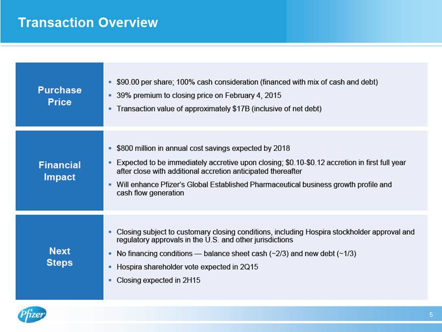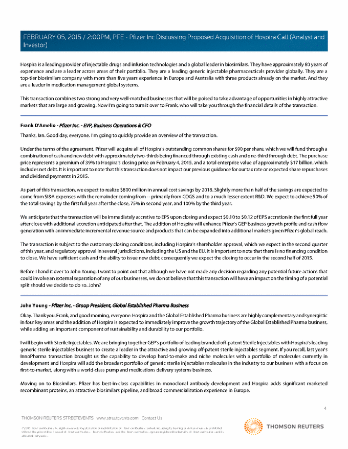 | FEBRUARY 05, 2015 / 2:00PM, PFE - Pfizer Inc Discussing Proposed Acquisition of Hospira Call (Analyst and Investor) Hospira is a leading provider of injectable drugs and infusion technologies and a global leader in biosimilars. They have approximately 80 years of experience and are a leader across areas of their portfolio. They are a leading generic injectable pharmaceuticals provider globally. They are a top-tier biosimilars company with more than five years experience in Europe and Australia with three products already on the market. And they are a leader in medication management global systems. This transaction combines two strong and very well-matched businesses that will be poised to take advantage of opportunities in highly attractive markets that are large and growing. Now I’m going to turn it over to Frank, who will take you through the financial details of the transaction. Frank D’Amelio - Pfizer Inc. - EVP, Business Operations & CFO Thanks, Ian. Good day, everyone. I’m going to quickly provide an overview of the transaction. Under the terms of the agreement, Pfizer will acquire all of Hospira’s outstanding common shares for $90 per share, which we will fund through a combination of cash and new debt with approximately two-thirds being financed through existing cash and one-third through debt. The purchase price represents a premium of 39% to Hospira’s closing price on February 4, 2015, and a total enterprise value of approximately $17 billion, which includes net debt. It is important to note that this transaction does not impact our previous guidance for our tax rate or expected share repurchases and dividend payments in 2015. As part of this transaction, we expect to realize $800 million in annual cost savings by 2018. Slightly more than half of the savings are expected to come from SI&A expenses with the remainder coming from - primarily from COGS and to a much lesser extent R&D. We expect to achieve 50% of the total savings by the first full year after the close, 75% in second year, and 100% by the third year. We anticipate that the transaction will be immediately accretive to EPS upon closing and expect $0.10 to $0.12 of EPS accretion in the first full year after close with additional accretion anticipated after that. The addition of Hospira will enhance Pfizer’s GEP business growth profile and cash flow generation with an immediate incremental revenue source and products that can be expanded into additional markets given Pfizer’s global reach. The transaction is subject to the customary closing conditions, including Hospira’s shareholder approval, which we expect in the second quarter of this year, and regulatory approval in several jurisdictions, including the US and the EU. It is important to note that there is no financing condition to close. We have sufficient cash and the ability to issue new debt; consequently we expect the closing to occur in the second half of 2015. Before I hand it over to John Young, I want to point out that although we have not made any decision regarding any potential future actions that could involve an external separation of any of our businesses, we do not believe that this transaction will have an impact on the timing of a potential split should we decide to do so. John? John Young - Pfizer Inc. - Group President, Global Established Pharma Business Okay. Thankyou, Frank, and good morning, everyone. Hospira and the Global Established Pharma business arehighly complementary and synergistic in four key areas and the addition of Hospira is expected to immediately improve the growth trajectory of the Global Established Pharma business, while adding an important component of sustainability and durability to our portfolio. I will begin with Sterile Injectables. We are bringing together GEP’s portfolio of leading branded off-patent Sterile Injectables with Hospira’s leading generic sterile injectables business to create a leader in the attractive and growing off-patent sterile injectables segment. If you recall, last year’s InnoPharma transaction brought us the capability to develop hard-to-make and niche molecules with a portfolio of molecules currently in development and Hospira will add the broadest portfolio of generic sterile injectables molecules in the industry to our business with a focus on first-to-market, along with a world-class pump and medications delivery systems business. Moving on to Biosimilars. Pfizer has best-in-class capabilities in monoclonal antibody development and Hospira adds significant marketed recombinant proteins, an attractive biosimilars pipeline, and broad commercialization experience in Europe. 4 THOMSON REUTERS STREETEVENTS | www.streetevents.com | Contact Us c2015 Thomson Reuters. All rights reserved. Republication or redistribution of Thomson Reuters content, including by framing or similar means, is prohibited without the prior written consent of Thomson Reuters. ‘Thomson Reuters’ and the Thomson Reuters logo are registered trademarks of Thomson Reuters and its affiliated companies. |