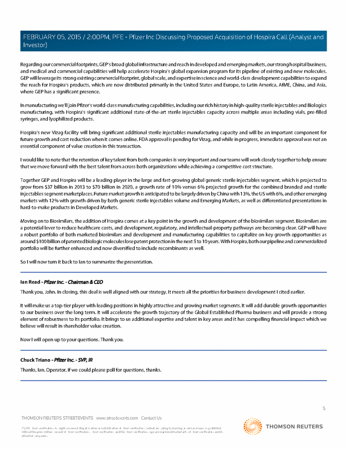 | FEBRUARY 05, 2015 / 2:00PM, PFE - Pfizer Inc Discussing Proposed Acquisition of Hospira Call (Analyst and Investor) Regarding our commercial footprints, GEP’s broad global infrastructure and reach in developed and emerging markets, our strong hospital business, and medical and commercial capabilities will help accelerate Hospira’s global expansion program for its pipeline of existing and new molecules. GEP will leverage its strong existing commercial footprint, global scale, and expertise in science and world-class development capabilities to expand the reach for Hospira’s products, which are now distributed primarily in the United States and Europe, to Latin America, AfME, China, and Asia, where GEP has a significant presence. In manufacturing we’ll join Pfizer’s world-class manufacturing capabilities, including our rich history in high-quality sterile injectables and Biologics manufacturing, with Hospira’s significant additional state-of-the-art sterile injectables capacity across multiple areas including vials, pre-filled syringes, and lyophilized products. Hospira’s new Vizag facility will bring significant additional sterile injectables manufacturing capacity and will be an important component for future growth and cost reduction when it comes online. FDA approval is pending for Vizag, and while in progress, immediate approval was not an essential component of value creation in this transaction. I would like to note that the retention of key talent from both companies is very important and our teams will work closely together to help ensure that we move forward with the best talent from across both organizations while achieving a competitive cost structure. Together GEP and Hospira will be a leading player in the large and fast-growing global generic sterile injectables segment, which is projected to grow from $37 billion in 2013 to $70 billion in 2020, a growth rate of 10% versus 6% projected growth for the combined branded and sterile injectables segment marketplaces. Future market growth is anticipated to be largely driven by China with 13%, the US with 6%, and other emerging markets with 12% with growth driven by both generic sterile injectables volume and Emerging Markets, as well as differentiated presentations in hard-to-make products in Developed Markets. Moving on to Biosimilars, the addition of Hospira comes at a key point in the growth and development of the biosimilars segment. Biosimilars are a potential lever to reduce healthcare costs, and development, regulatory, and intellectual-property pathways are becoming clear. GEP will have a robust portfolio of both marketed biosimilars and development and manufacturing capabilities to capitalize on key growth opportunities as around $100 billion of patented biologic molecules lose patent protection in the next 5 to 10 years. With Hospira, both our pipeline and commercialized portfolio will be further enhanced and now diversified to include recombinants as well. So I will now turn it back to Ian to summarize the presentation. Ian Read - Pfizer Inc. - Chairman & CEO Thank you, John. In closing, this deal is well aligned with our strategy. It meets all the priorities for business development I cited earlier. It will make us a top-tier player with leading positions in highly attractive and growing market segments. It will add durable growth opportunities to our business over the long term. It will accelerate the growth trajectory of the Global Established Pharma business and will provide a strong element of robustness to its portfolio. It brings to us additional expertise and talent in key areas and it has compelling financial impact which we believe will result in shareholder value creation. Now I will open up to your questions. Thankyou. Chuck Triano - Pfizer Inc. - SVP, IR Thanks, Ian. Operator, if we could please poll for questions, thanks. 5 THOMSON REUTERS STREETEVENTS | www.streetevents.com | Contact Us 82015 Thomson Reuters. All rights reserved. Republication or redistribution of Thomson Reuters content, including by framing or similar means, is prohibited without the prior written consent of Thomson Reuters. ‘Thomson Reuters’ and the Thomson Reuters logo are registered trademarks of Thomson Reuters and its affiliated companies. |