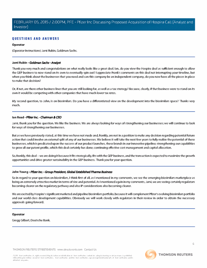 | FEBRUARY 05, 2015 / 2:00PM, PFE - Pfizer Inc Discussing Proposed Acquisition of Hospira Call (Analyst and Investor) QUESTIONS AND ANSWERS Operator (Operator Instructions) Jami Rubin, Goldman Sachs. Jami Rubin - Goldman Sachs - Analyst Thank you very much and congratulations on what really looks like a great deal. Ian, do you view the Hospira deal as sufficient enough to allow the GEP business to now stand on its own to eventually spin out? I appreciate Frank’s comments on this deal not interrupting your timeline, but when you think about the businesses that you need and can this company be an independent company, do you now have all the pieces in place to make that decision? Or, if not, are there other business lines that you are still looking for, as well as a tax strategy? Because, clearly, if that business were to stand on its own it would be competing with other companies that have much lower tax rates. My second question, to John, is on biosimilars. Do you have a differentiated view on the development into the biosimilars space? Thanks very much. Ian Read - Pfizer Inc. - Chairman & CEO Jami, thank you for the question. We like the business. We are always looking for ways of strengthening our businesses; we will continue to look for ways of strengthening our businesses. But as we have previously stated, at this time we have not made and, frankly, are not in a position to make any decision regarding potential future action that could involve an external split of any of our businesses. We believe it will take the next few years to fully realize the potential of these businesses, which is predicated upon the success of our product launches, these brands in our Innovative pipeline; strengthening our capabilities to grow all our patent profile, which this deal certainly has done; continuing effective cost management and capital allocation. So, frankly, this deal — we are doing it becuse it fits strategically, fits with the GEP business, and the transaction is expected to maximize the growth opportunities and drive greater sustainability in the GEP business. Thank you for your question. John Young - Pfizer Inc. - Group President, Global Established Pharma Business So in regard to your question on biosimilars, I think first of all, as I mentioned in my comments, we see the emerging biosimilars marketplace as being an extremely attractive market in terms of size and potential. As I mentioned again in my comments, Jami, we are seeing certainly regulators becoming clearer on the regulatory pathway and also IP considerations also becoming clearer. We are excited by Hospira’s significant marketed and pipeline biosimilars portfolio, because it will complement Pfizer’s evolving biosimilars portfolio and our world-class development capabilities. Obviously we will work closely with regulators in their review in order to obtain the necessary approvals going forward. Operator Gregg Gilbert, Deutsche Bank. 7 THOMSON REUTERS STREETEVENTS | www.streetevents.com | Contact Us c2015 Thomson Reuters. All rights reserved. Republication or redistribution of Thomson Reuters content, including by framing or similar means, is prohibited without the prior written consent of Thomson Reuters. ‘Thomson Reuters’ and the Thomson Reuters logo are registered trademarks of Thomson Reuters and its affiliated companies. |