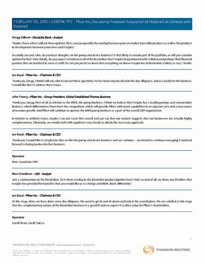 | FEBRUARY 05, 2015 / 2:00PM, PFE - Pfizer Inc Discussing Proposed Acquisition of Hospira Call (Analyst and Investor) Gregg Gilbert - Deutsche Bank - Analyst Thanks, I have a few; I will ask them up front. First, can you quantify the overlap between your on-market injectable products as well as the products in development between yourselves and Hospira? Secondly, Ian and John, do you have thoughts on the pump and device business? Is that likely to remain part of the portfolio, or will you consider options for that? And, thirdly, do you expect to hold on to all of the biosimilars that Hospira had partnered with Celltrion and perhaps their financial partners that are involved in some as well? So can you just let us know that everything we know Hospira has in biosimilars is likely to stay? Thanks. Ian Read - Pfizer Inc. - Chairman & CEO Thank you, Gregg. I think I will ask John to answer these questions. He has been very involved in the due diligence, and as a leader in this business, I would like him to address these issues. John Young - Pfizer Inc. - Group President, Global Established Pharma Business Thank you, Gregg. First of all, in relation to the MMS, the pump business, I think we believe that Hospira has a leading pumps and consumables business, which differentiates them from the competition, which will provide Pfizer with novel capabilities in an adjacent area and a new source of revenue growth. And Pfizer will continue to operate the MMS pump business as a part of the overall GEP organization. In relation to antitrust issues, maybe I can just cover that overall and just say that our analysis suggests that our businesses are actually highly complementary. Obviously, we would work with regulators very closely to obtain the necessary approvals. Ian Read - Pfizer Inc. - Chairman & CEO Thank you. I would like to emphasize that we like the pump and device business and we continue - we intend to continue managing it and look forward to being involved in that business. Operator Marc Goodman, UBS. Marc Goodman - UBS - Analyst Just a continuation on the biosimilars. So is there overlap in the biosimilar product pipeline here? And, second of all, are there any timelines that Hospira has provided for launches that you would like us to change and think about differently? Ian Read - Pfizer Inc. - Chairman & CEO At this stage, Marc, we have done some due diligence. We need to get in and sit down and look at the overall plans. We are satisfied at this stage that the complementary nature of the biosimilars business is a good fit and we expect it to drive value for Pfizer’s shareholders. Operator Vamil Divan, Credit Suisse. 8 THOMSON REUTERS STREETEVENTS | www.streetevents.com | Contact Us c2015 Thomson Reuters. All rights reserved. Republication or redistribution of Thomson Reuters content, including by framing or similar means, is prohibited without the prior written consent of Thomson Reuters. ‘Thomson Reuters’ and the Thomson Reuters logo are registered trademarks of Thomson Reuters and its affiliated companies. |