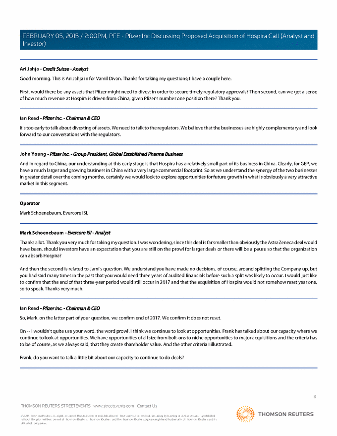 | FEBRUARY 05, 2015 / 2:00PM, PFE - Pfizer Inc Discussing Proposed Acquisition of Hospira Call (Analyst and Investor) Ari Jahja - Credit Suisse - Analyst Good morning. This is Ari Jahja in for Vamil Divan. Thanks for taking my questions; I have a couple here. First, would there be any assets that Pfizer might need to divest in order to secure timely regulatory approvals? Then second, can we get a sense of how much revenue at Hospira is driven from China, given Pfizer’s number one position there? Thank you. Ian Read - Pfizer Inc. - Chairman & CEO It’s too early to talk about divesting of assets. We need to talk to the regulators. We believe that the businesses are highly complementary and look forward to our conversations with the regulators. John Young - Pfizer Inc. - Group President, Global Established Pharma Business And in regard to China, our understanding at this early stage is that Hospira has a relatively small part of its business in China. Clearly, for GEP, we have a much larger and growing business in China with a very large commercial footprint. So as we understand the synergy of the two businesses in greater detail over the coming months, certainly we would look to explore opportunities for future growth in what is obviously a very attractive market in this segment. Operator Mark Schoenebaum, Evercore ISI. Mark Schoenebaum - Evercore ISI - Analyst Thanks a lot. Thank you very much for taking my question. I was wondering, since this deal is far smaller than obviously the AstraZeneca deal would have been, should investors have an expectation that you are still on the prowl for larger deals or there will be a pause so that the organization can absorb Hospira? And then the second is related to Jami’s question. We understand you have made no decisions, of course, around splitting the Company up, but you had said many times in the past that you would need three years of audited financials before such a split was likely to occur. I would just like to confirm that the end of that three-year period would still occur in 2017 and that the acquisition of Hospira would not somehow reset year one, so to speak. Thanks very much. Ian Read - Pfizer Inc. - Chairman & CEO So, Mark, on the latter part of your question, we confirm end of 2017. We confirm it does not reset. On — I wouldn’t quite use your word, the word prowl. I think we continue to look at opportunities. Frank has talked about our capacity where we continue to look at opportunities. We have opportunities of all size from bolt-ons to niche opportunities to major acquisitions and the criteria has to be of course, as we always said, that they create shareholder value. And the other criteria I illustrated. Frank, do you want to talk a little bit about our capacity to continue to do deals? 8 THOMSON REUTERS STREETEVENTS | www.streetevents.com | Contact Us c2015 Thomson Reuters. All rights reserved. Republication or redistribution of Thomson Reuters content, including by framing or similar means, is prohibited without the prior written consent of Thomson Reuters. ‘Thomson Reuters’ and the Thomson Reuters logo are registered trademarks of Thomson Reuters and its affiliated companies. |