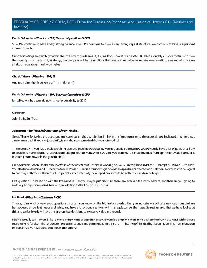 | FEBRUARY 05, 2015 / 2:00PM, PFE - Pfizer Inc Discussing Proposed Acquisition of Hospira Call (Analyst and Investor) Frank D’Amelio - Pfizer Inc. - EVP, Business Operations & CFO Sure. We continue to have a very strong balance sheet. We continue to have a very strong capital structure. We continue to have a significant amount of cash. Our credit ratings are very high within the investment grade area: A, A+, AA. If you look at our debt to EBITDA it’s roughly 2. So we continue to have the capacity to do deals and, as always, our compass will be transactions that create shareholder value. We are agnostic to size and what we are all about is creating shareholder value. Chuck Triano - Pfizer Inc. - SVP, IR And regarding the three years of financials for -? Frank D’Amelio - Pfizer Inc. - EVP, Business Operations & CFO Ian talked on that. We said no change to our ability to 2017. Operator John Boris, SunTrust. John Boris - SunTrust Robinson Humphrey-Analyst Great. Thanks for taking the questions and Congrats on the deal. So, Ian, I think in the fourth-quarter conference call, you indicated that there was a near-term deal. If you can just clarify, is this the near-term deal that you referred to? Then secondly, if you had a scale weighing branded pipeline opportunity versus generic opportunity, you obviously have a lot of powder still dry to be able to make additional acquisitions and put that to work. Which way are you leaning? Is it more branded from up the innovation core, or is it leaning more towards the generic side? On biosimilars, when I look at the portfolio of the assets that Hospira is working on, you currently have in Phase 3 Herceptin, Rituxan, Remicade. You also have Avastin and Humira that are in Phase 1. That is a mirror image of what Hospira has partnered with Celltrion, so wouldn’t it be logical to part way with the Celltrion assets, especially since internally developed ones would be better to maintain or keep? Last question just has to do with the breakup fee. Can you maybe just discuss is there any breakup fee involved here, and then are you going to seek regulatory approval in China also, in addition to the US and EU? Thanks. Ian Read - Pfizer Inc. - Chairman & CEO Thanks, John. A lot of very good questions as usual. You know, on the biosimilars overlap that you indicate, we will take new decisions that are best focused on patient needs and value, and have a lot of conversations with the regulators on that issue. So rest assured that we have looked at this and we believe it will take the appropriate decisions to conserve value in the deal. I didn’t actually say —I would like to make a slight correction; I didn’t say we were looking for a short-term deal on the fourth quarter. I said we were more looking for deals that produce short-term revenue and earnings. So this is not an indication of the deal has been made. This is an indication of a deal that we have done that meets that criteria. THOMSON REUTERS STREETEVENTS | www.streetevents.com | Contact Us c2015 Thomson Reuters. All rights reserved. Republication or redistribution of Thomson Reuters content, including by framing or similar means, is prohibited without the prior written consent of Thomson Reuters. ‘Thomson Reuters’ and the Thomson Reuters logo are registered trademarks of Thomson Reuters and its affiliated companies. |