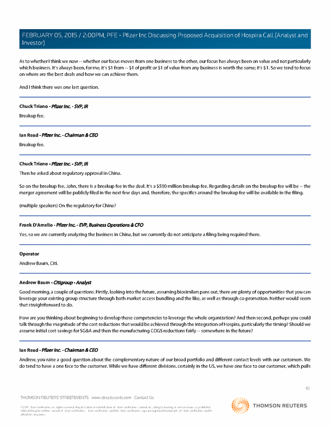 | FEBRUARY 05, 2015 / 2:00PM, PFE - Pfizer Inc Discussing Proposed Acquisition of Hospira Call (Analyst and Investor) As to whether I think we now - whether our focus moves from one business to the other, our focus has always been on value and not particularly which business. It’s always been, for me, it’s $1 from — $1 of profit or $1 of value from any business is worth the same; it’s $1. So we tend to focus on where are the best deals and how we can achieve them. And I thinkthere was one last question. Chuck Triano - Pfizer Inc. - SVP, IR Breakup fee. Ian Read - Pfizer Inc. - Chairman & CEO Breakup fee. Chuck Triano - Pfizer Inc. - SVP, IR Then he asked about regulatory approval in China. So on the breakup fee, John, there is a breakup fee in the deal. It’s a $500 million breakup fee. Regarding details on the breakup fee will be — the merger agreement will be publicly filed in the next few days and, therefore, the specifics around the breakup fee will be available in the filing. (multiple speakers) On the regulatory for China? Frank D’Amelio - Pfizer Inc. - EVP, Business Operations & CFO Yes, so we are currently analyzing the business in China, but we currently do not anticipate a filing being required there. Operator Andrew Baum,Citi. Andrew Baum - Citigroup - Analyst Good morning, a couple of questions. Firstly, looking into the future, assuming biosimilars pans out, there are plenty of opportunities that you can leverage your existing group structure through both market access bundling and the like, as well as through co-promotion. Neither would seem that straightforward to do. How are you thinking about beginning to develop those competencies to leverage the whole organization? And then second, perhaps you could talk through the magnitude of the cost reductions that would be achieved through the integration of Hospira, particularly the timing? Should we assume initial cost savings for SG&A and then the manufacturing COGS reductions fairly - somewhere in the future? Ian Read - Pfizer Inc. - Chairman & CEO Andrew, you raise a good question about the complementary nature of our broad portfolio and different contact levels with our customers. We do tend to have a one face to the customer. While we have different divisions, certainly in the US, we have one face to our customer, which pulls 21 THOMSON REUTERS STREETEVENTS | www.streetevents.com | Contact Us c2015 Thomson Reuters. All rights reserved. Republication or redistribution of Thomson Reuters content, including by framing or similar means, is prohibited without the prior written consent of Thomson Reuters. ‘Thomson Reuters’ and the Thomson Reuters logo are registered trademarks of Thomson Reuters and its affiliated companies. |