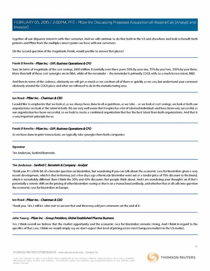| FEBRUARY 05, 2015 / 2:00PM, PFE - Pfizer Inc Discussing Proposed Acquisition of Hospira Call (Analyst and Investor) together all our disparate interests with that customer. And we will continue to do that both in the US and elsewhere and look to benefit both patients and Pfizer from the multiple contact points we have with our customers. On the second question of the magnitude, Frank, would you like to answer that please? Frank D’Amelio - Pfizer Inc. - EVP, Business Operations & CFO Sure. In terms of magnitude of the cost savings, $800 million. Essentially over three years: 50% by year one, 75% by year two, 100% by year three. More than half of those cost synergies are in SI&A, while of the remainder — the remainder is primarily COGS with, to a much lesser extent, R&D. And then in terms of the cadence, obviously we will get as much as we can from all of them as quickly as we can, but understand your comment obviously around the COGS piece and what we will need to do in the manufacturing area. Ian Read - Pfizer Inc. - Chairman & CEO I would like to emphasize that we look at, as we always have done in all acquisitions, as we take - as we look at cost savings, we look at both our organizations; we look at the talent in both. We are very well aware that Hospira has a lot of talented individuals and have been very successful, as our organization has been successful, so we look to create a combined organization that has the best talent from both organizations. And that is a very important principle for us. Frank D’Amelio - Pfizer Inc. - EVP, Business Operations & CFO As we have done in prior transactions, we typically take synergies from both companies. Operator Tim Anderson, Sanford Bernstein. Tim Anderson - Sanford C. Bernstein & Company-Analyst Thank you. It’s a little bit of a broader question on biosimilars, but wondering if you can talk about the economic case for biosimilars given a very recent development, which is that in Norway just a few days ago a Remicade biosimilar went out at a tender price of 70% discount to the brand, which is remarkably different than I think the 30% and 40% discounts that people think about. And I am wondering your thoughts on if that’s potentially a seismic shift on the pricing of other biosimilars seeing as that is on a monoclonal antibody, and whether that at all calls into question the economic case for biosimilars in Europe. Ian Read - Pfizer Inc. - Chairman & CEO Thank you, Tim. I will let John start to answer that and then may add just comments on the end of it. John Young - Pfizer Inc. - Croup President, Global Established Pharma Business Yes, I think overall we believe that the market opportunity and the economic case for biosimilars remains strong. And I think in regard to the specifics of that case, I think we would simply say we don’t expect that level of pricing across most European markets in the US market. 22 THOMSON REUTERS STREETEVENTS | www.streetevents.com | Contact Us c2015 Thomson Reuters. All rights reserved. Republication or redistribution of Thomson Reuters content, including by framing or similar means, is prohibited without the prior written consent of Thomson Reuters. ‘Thomson Reuters’ and the Thomson Reuters logo are registered trademarks of Thomson Reuters and its affiliated companies. |