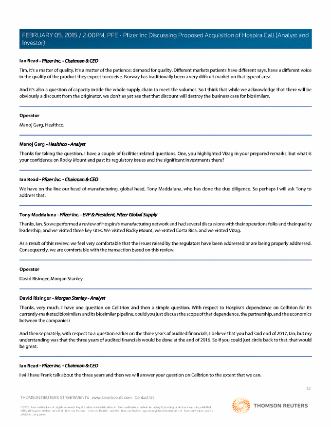 | FEBRUARY 05, 2015 / 2:00PM, PFE - Pfizer Inc Discussing Proposed Acquisition of Hospira Call (Analyst and Investor) Ian Read - Pfizer Inc. - Chairman & CEO Tim, it’s a matter of quality. It’s a matter of the patience; demand for quality. Different markets patients have different says, have a different voice in the quality of the product they expect to receive. Norway has traditionally been a very difficult market on that type of area. And it’s also a question of capacity inside the whole supply chain to meet the volumes. So I think that while we acknowledge that there will be obviously a discount from the originator, we don’t as yet see that that discount will destroy the business case for biosimilars. Operator Manoj Garg, Healthco. Manoj Garg - Healthco -Analyst Thanks for taking the question. I have a couple of facilities-related questions. One, you highlighted Vizag in your prepared remarks, but what is your confidence on Rocky Mount and past its regulatory issues and the significant investments there? Ian Read - Pfizer Inc. - Chairman & CEO We have on the line our head of manufacturing, global head, Tony Maddaluna, who has done the due diligence. So perhaps I will ask Tony to address that. Tony Maddaluna - Pfizer Inc. - EVP & President, Pfizer Global Supply Thanks, Ian. So we performed a review of Hospira’s manufacturing network and had several discussions with their operations folks and their quality leadership, and we visited three key sites. We visited Rocky Mount, we visited Costa Rica, and we visited Vizag. As a result of this review, we feel very comfortable that the issues raised by the regulators have been addressed or are being properly addressed. Consequently, we are comfortable with the transaction based on this review. Operator David Risinger, Morgan Stanley. David Risinger -Morgan Stanley - Analyst Thanks, very much. I have one question on Celltrion and then a simple question. With respect to Hospira’s dependence on Celltrion for its currently-marketed biosimilars and its biosimilar pipeline, could you just discuss the scope of that dependence, the partnership, and the economics between the companies? And then separately, with respect to a question earlier on the three years of audited financials, I believe that you had said end of 2017, Ian, but my understanding was that the three years of audited financials would be done at the end of 2016. So if you could just circle back to that, that would be great. Ian Read - Pfizer Inc. - Chairman & CEO I will have Frank talk about the three years and then we will answer your question on Celltrion to the extent that we can. THOMSON REUTERS STREETEVENTS | www.streetevents.com | Contact Us Thomson Reuters. All rights reserved. Republication or redistribution of Thomson Reuters content, including by framing or similar means, is prohibited without the prior written consent of Thomson Reuters. ‘Thomson Reuters’ and the Thomson Reuters logo are registered trademarks of Thomson Reuters and its affiliated companies. |