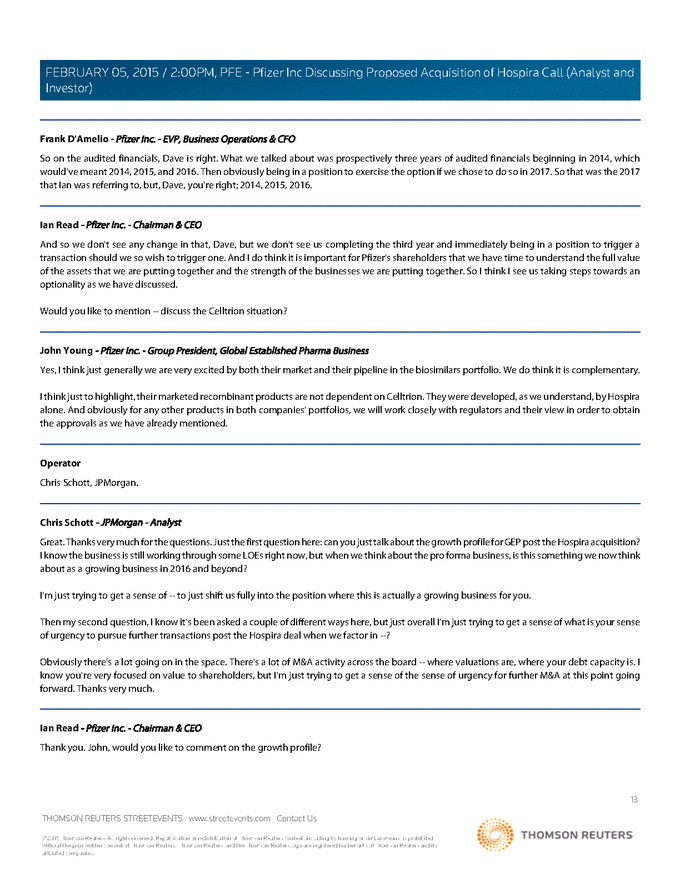 | FEBRUARY 05, 2015 / 2:00PM, PFE - Pfizer Inc Discussing Proposed Acquisition of Hospira Call (Analyst and Investor) Frank D’Amelio - Pfizer Inc. - EVP, Business Operations & CFO So on the audited financial, Dave is right. What we talked about was prospectively three years of audited financials beginning in 2014, which would’ve meant 2014, 2015, and 2016. Then obviously being in a position to exercise the option if we chose to do so in 2017. So that was the 2017 that Ian was referring to, but, Dave, you’re right; 2014, 2015, 2016. Ian Read - Pfizer Inc. - Chairman & CEO And so we don’t see any change in that, Dave, but we don’t see us completing the third year and immediately being in a position to trigger a transaction should we so wish to trigger one. And I do think it is important for Pfizer’s shareholders that we have time to understand the full value of the assets that we are putting together and the strength of the businesses we are putting together. So I think I see us taking steps towards an optionality as we have discussed. Would you like to mention — discuss the Celltrion situation? John Young - Pfizer Inc. - Group President, Global Established Pharma Business Yes, I think just generally we are very excited by both their market and their pipeline in the biosimilars portfolio. We do think it is complementary. I think just to highlight, their marketed recombinant products are not dependent on Celltrion. They were developed, as we understand, by Hospira alone. And obviously for any other products in both companies’ portfolios, we will work closely with regulators and their view in order to obtain the approvals as we have already mentioned. Operator Chris SchottJPMorgan. Chris Schott -JPMorgan -Analyst Great. Thanks very much for the questions. Just the first question here: can you just talk about the growth profile for GEP post the Hospira acquisition? I know the business is still working through some LOEs right now, but when we thinkabout the pro forma business, is this something we now think about as a growing business in 2016 and beyond? I’m just trying to get a sense of— to just shift us fully into the position where this is actually a growing business for you. Then my second question, I know it’s been asked a couple of different ways here, but just overall I’m just trying to get a sense of what is your sense of urgency to pursue further transactions post the Hospira deal when we factor in —? Obviously there’s a lot going on in the space. There’s a lot of M&A activity across the board - where valuations are, where your debt capacity is. I know you’re very focused on value to shareholders, but I’m just trying to get a sense of the sense of urgency for further M&A at this point going forward. Thanks very much. Ian Read - Pfizer Inc. - Chairman & CEO Thank you. John, would you like to comment on the growth profile? THOMSON REUTERS STREETEVENTS | www.streetevents.com | Contact Us 82015 Thomson Reuters. All rights reserved. Republication or redistribution of Thomson Reuters content, including by framing or similar means, is prohibited without the prior written consent of Thomson Reuters. ‘Thomson Reuters’ and the Thomson Reuters logo are registered trademarks of Thomson Reuters and its affiliated companies. |