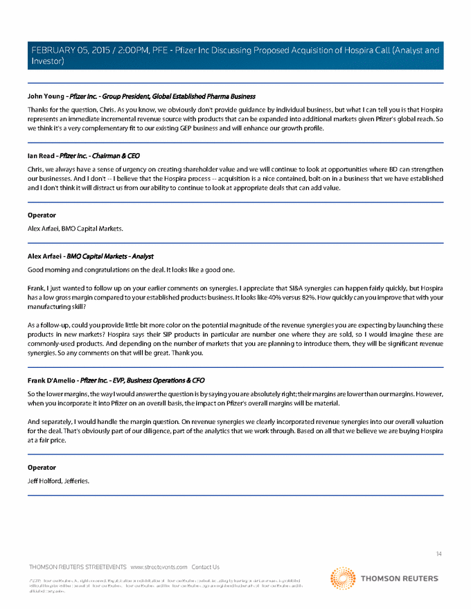 | FEBRUARY 05, 2015 / 2:00PM, PFE - Pfizer Inc Discussing Proposed Acquisition of Hospira Call (Analyst and Investor) John Young - Pfizer Inc. - Group President, Global Established Pharma Business Thanks for the question, Chris. As you know, we obviously don’t provide guidance by individual business, but what I can tell you is that Hospira represents an immediate incremental revenue source with products that can be expanded into additional markets given Pfizer’s global reach. So we think it’s a very complementary fit to our existing GEP business and will enhance our growth profile. Ian Read - Pfizer Inc. - Chairman & CEO Chris, we always have a sense of urgency on creating shareholder value and we will continue to look at opportunities where BD can strengthen our businesses. And I don’t —I believe that the Hospira process — acquisition is a nice contained, bolt-on in a business that we have established and I don’t think it will distract us from our ability to continue to look at appropriate deals that can add value. Operator Alex Arfaei, BMO Capital Markets. Alex Arfaei - BMO Capital Markets - Analyst Good morning and congratulations on the deal. It looks like a good one. Frank, I just wanted to follow up on your earlier comments on synergies. I appreciate that SI&A synergies can happen fairly quickly, but Hospira has a low gross margin compared to your established products business. It looks like 40% versus 82%. How quickly can you improve that with your manufacturing skill? As a follow-up, could you provide little bit more color on the potential magnitude of the revenue synergies you are expecting by launching these products in new markets? Hospira says their SIP products in particular are number one where they are sold, so I would imagine these are commonly-used products. And depending on the number of markets that you are planning to introduce them, they will be significant revenue synergies. So any comments on that will be great. Thank you. Frank D’Amelio - Pfizer Inc. - EVP, Business Operations & CFO So the lower margins, the way I would answer the question is by saying you are absolutely right; their margins are lower than our margins. However, when you incorporate it into Pfizer on an overall basis, the impact on Pfizer’s overall margins will be material. And separately, I would handle the margin question. On revenue synergies we clearly incorporated revenue synergies into our overall valuation for the deal. That’s obviously part of our diligence, part of the analytics that we work through. Based on all that we believe we are buying Hospira at a fair price. Operator JeffHolford, Jefferies. THOMSON REUTERS STREETEVENTS | www.streetevents.com | Contact Us c2015 Thomson Reuters. All rights reserved. Republication or redistribution of Thomson Reuters content, including by framing or similar means, is prohibited without the prior written consent of Thomson Reuters. ‘Thomson Reuters’ and the Thomson Reuters logo are registered trademarks of Thomson Reuters and its affiliated companies. |