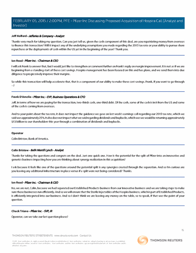 | FEBRUARY 05, 2015 / 2:00PM, PFE - Pfizer Inc Discussing Proposed Acquisition of Hospira Call (Analyst and Investor) Jeff Holford - Jefferies & Company - Analyst Thanks very much for taking my question. Can you just tell us, given the cash component of this deal, are you repatriating money from overseas to finance this transaction? Will it impact any of the underlying assumptions you made regarding the 2015 tax rate or your ability to pursue share repurchase or the deployments of cash within the US yet in the beginning of the year? Thank you. Ian Read - Pfizer Inc. - Chairman & CEO I will ask Frank to answer that, but I would just like to strengthen or comment further on Frank’s reply on margin improvement. It is not as if we are beginning from a standing start of these cost savings. Hospira management has been focused on this and has plans, and we send them into due diligence to progressively improve their margins. So while this transaction will help accelerate that, that is a component of our ability to make these cost savings. Frank, if you want to go through —? Frank D’Amelio - Pfizer Inc. - EVP, Business Operations & CFO Jeff, in terms of how we are paying for the transaction, two-thirds cash, one-third debt. Of the cash, some of the cash is in it from the US and some of the cash is coming from overseas. And to your point about the tax rate, it does not impact the guidance we gave on last week’s earnings call regarding our 2015 tax rate, which we said was approximately 25%. It also does not impact what we said regarding dividends and buybacks, which was we would be returning approximately $13 billion to our shareholders this year through a combination of dividends and buybacks. Operator Colin Bristow, Bank of America. Colin Bristow - BofA Merrill Lynch -Analyst Thanks for taking the questions and Congrats on the deal. Just one quick one. How is the potential for the split of Pfizer into an innovative and generics business impacting how you are thinking about synergy realization in this acquisition? I ask because it feels like one of the questions around the potential split is any synergies created through the separation. And so I’m curious are you leaving any additional infrastructure in place versus if a split were not being considered? Thanks. Ian Read - Pfizer Inc. - Chairman & CEO No, we are not, Colin, because we had separated our Established Products business from our Innovative business and we are taking steps to make sure those businesses run efficiently. And so we will ensure that the Sterile Injectables of the Hospira business, which is part of Established Products, is efficiently integrated into our business. And so I don’t think we are leaving any money on the table, so to speak, if that was the point of your question. Chuck Triano - Pfizer Inc. - SVP, IR Operator, can we take our last question please? THOMSON REUTERS STREETEVENTS | www.streetevents.com | Contact Us c2015 Thomson Reuters. All rights reserved. Republication or redistribution of Thomson Reuters content, including by framing or similar means, is prohibited without the prior written consent of Thomson Reuters. ‘Thomson Reuters’ and the Thomson Reuters logo are registered trademarks of Thomson Reuters and its affiliated companies. |