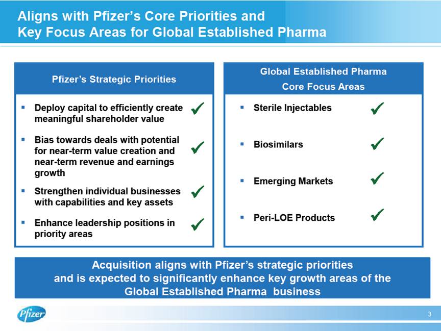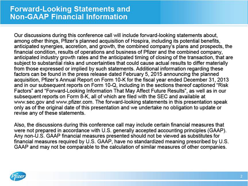 | Forward-Looking Statements and Non-GAAP Financial Information Our discussions during this conference call will include forward-looking statements about, among other things, Pfizer’s planned acquisition of Hospira, including its potential benefits, anticipated synergies, accretion, and growth, the combined company’s plans and prospects, the financial condition, results of operations and business of Pfizer and the combined company, anticipated industry growth rates and the anticipated timing of closing of the transaction, that are subject to substantial risks and uncertainties that could cause actual results to differ materially from those expressed or implied by such statements. Additional information regarding these factors can be found in the press release dated February 5, 2015 announcing the planned acquisition, Pfizer’s Annual Report on Form 10-K for the fiscal year ended December 31, 2013 and in our subsequent reports on Form 10-Q, including in the sections thereof captioned “Risk Factors” and “Forward-Looking Information That May Affect Future Results”, as well as in our subsequent reports on Form 8-K, all of which are filed with the SEC and available at www.sec.gov and www.pfizer.com. The forward-looking statements in this presentation speak only as of the original date of this presentation and we undertake no obligation to update or revise any of these statements. Also, the discussions during this conference call may include certain financial measures that were not prepared in accordance with U.S. generally accepted accounting principles (GAAP). Any non-U.S. GAAP financial measures presented should not be viewed as substitutes for financial measures required by U.S. GAAP, have no standardized meaning prescribed by U.S. GAAP and may not be comparable to the calculation of similar measures of other companies. 2 |