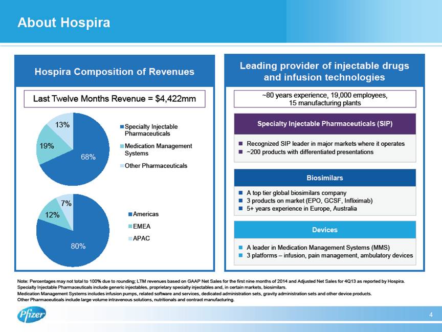 | Aligns with Pfizer’s Core Priorities and Key Focus Areas for Global Established Pharma 3 Global Established Pharma Core Focus Areas Pfizer’s Strategic Priorities # Deploy capital to efficiently create meaningful shareholder value # Bias towards deals with potential for near-term value creation and near-term revenue and earnings growth # Strengthen individual businesses with capabilities and key assets # Enhance leadership positions in priority areas # Sterile Injectables # Biosimilars # Emerging Markets # Peri-LOE Products Acquisition aligns with Pfizer’s strategic priorities and is expected to significantly enhance key growth areas of the Global Established Pharma business |