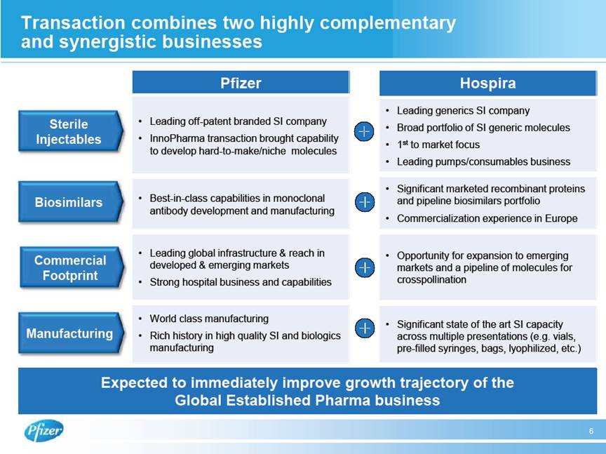 | Transaction Overview 5 Purchase Price # $90.00 per share; 100% cash consideration (financed with mix of cash and debt) # 39% premium to closing price on February 4, 2015 # Transaction value of approximately $17B (inclusive of net debt) Financial Impact # $800 million in annual cost savings expected by 2018 # Expected to be immediately accretive upon closing; $0.10-$0.12 accretion in first full year after close with additional accretion anticipated thereafter # Will enhance Pfizer’s Global Established Pharmaceutical business growth profile and cash flow generation Next Steps # Closing subject to customary closing conditions, including Hospira stockholder approval and regulatory approvals in the U.S. and other jurisdictions # No financing conditions — balance sheet cash (~2/3) and new debt (~1/3) # Hospira shareholder vote expected in 2Q15 # Closing expected in 2H15 |