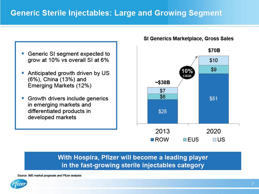 | Transaction combines two highly complementary and synergistic businesses Sterile Injectables Expected to immediately improve growth trajectory of the Global Established Pharma business 6 Biosimilars Commercial Footprint Manufacturing Pfizer • Leading off-patent branded SI company • InnoPharma transaction brought capability to develop hard-to-make/niche molecules • Best-in-class capabilities in monoclonal antibody development and manufacturing • Leading global infrastructure & reach in developed & emerging markets • Strong hospital business and capabilities • World class manufacturing • Rich history in high quality SI and biologics manufacturing Hospira • Leading generics SI company • Broad portfolio of SI generic molecules • 1st to market focus • Leading pumps/consumables business • Significant marketed recombinant proteins and pipeline biosimilars portfolio • Commercialization experience in Europe • Opportunity for expansion to emerging markets and a pipeline of molecules for crosspollination • Significant state of the art SI capacity across multiple presentations (e.g. vials, pre-filled syringes, bags, lyophilized, etc.) |