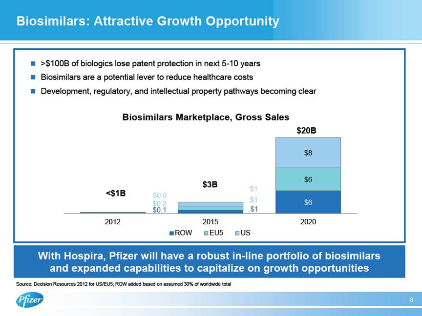 | Generic Sterile Injectables: Large and Growing Segment 7 With Hospira, Pfizer will become a leading player in the fast-growing sterile injectables category $25 $51 $6 $9 $7 $10 2013 2020 ROW EU5 US ~$38B $70B # Generic SI segment expected to grow at 10% vs overall SI at 6% # Anticipated growth driven by US (6%), China (13%) and Emerging Markets (12%) # Growth drivers include generics in emerging markets and differentiated products in developed markets Source: IMS market prognosis and Pfizer analysis 10% CAGR SI Generics Marketplace, Gross Sales |