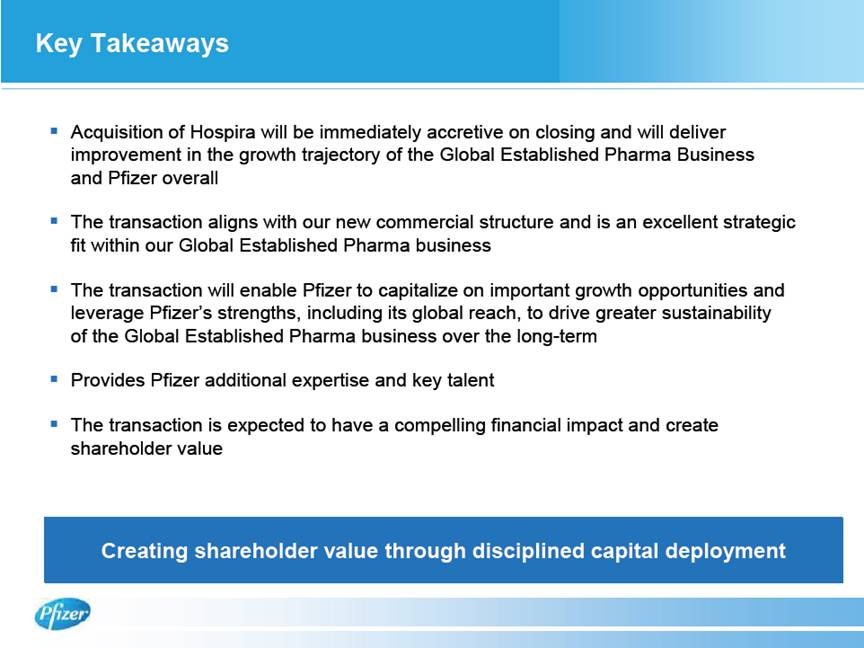 | Key Takeaways # Acquisition of Hospira will be immediately accretive on closing and will deliver improvement in the growth trajectory of the Global Established Pharma Business and Pfizer overall # The transaction aligns with our new commercial structure and is an excellent strategic fit within our Global Established Pharma business # The transaction will enable Pfizer to capitalize on important growth opportunities and leverage Pfizer’s strengths, including its global reach, to drive greater sustainability of the Global Established Pharma business over the long-term # Provides Pfizer additional expertise and key talent # The transaction is expected to have a compelling financial impact and create shareholder value Creating shareholder value through disciplined capital deployment |