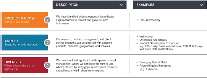 Our strategy is focused on helping to define and serve our clients’ needs in a dynamic and competitive asset management landscape. Our strategic framework consists of three pillars: Protect and Grow our core businesses, Amplify our strengths not fully leveraged, and Diversify where clients give us the right to win.