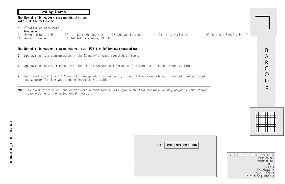 BARCODE 123456789012 123456789012 123456789012 123456789012 123456789012 123456789012 123456789012 123456789012 123456789012 123456789012 123456789012 123456789012 Broadridge Internal Use Only xxxxxxxxxx xxxxxxxxxx Cusip Job # Envelope # Sequence # # of # Sequence # Voting items 0000248081_3 R1.0.0.51160 The Board of Directors recommends that you vote FOR the following: 1. Election of Directors Nominees 01 Eckard Weber, M.D. 02 Linda S. Grais, M.D. 03 Steven P. James 04 Nina Kjellson 05 Michael Powell, Ph. D. 06 Anne M. VanLent 07 Wendell Wierenga, Ph. D The Board of Directors recommends you vote FOR the following proposal(s): 2. Approval of the compensation of the Company's Named Executed Officers. 3. Approval of Ocera Therapeutics, Inc. Third Amended and Restated 2011 Stock Option and Incentive Plan. 4. Ratification of Ernst & Young LLP, independent accountants, to audit the consolidated financial Statements of the Company for the year ending December 31, 2015. NOTE: In their discretion, the proxies are authorized to vote upon such other business as may properly come before the meeting or any adjournment thereof. |