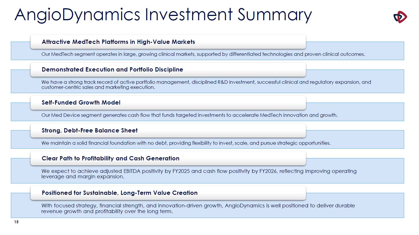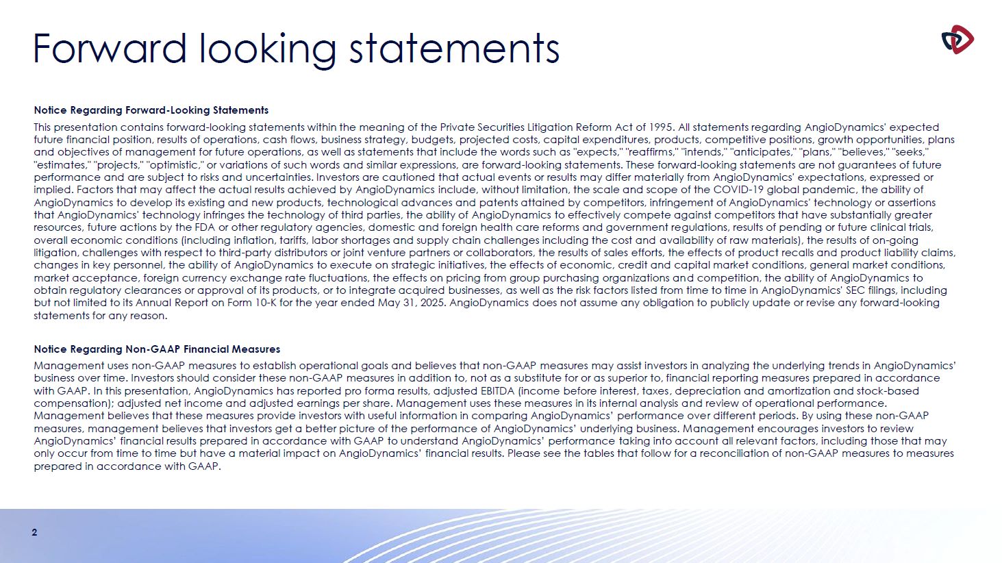 presentation contains forward-looking statements within the meaning of the Private Securities Litigation Reform Act of 1995. All statements regarding AngioDynamics' expected future financial position, results of operations, cash flows, business