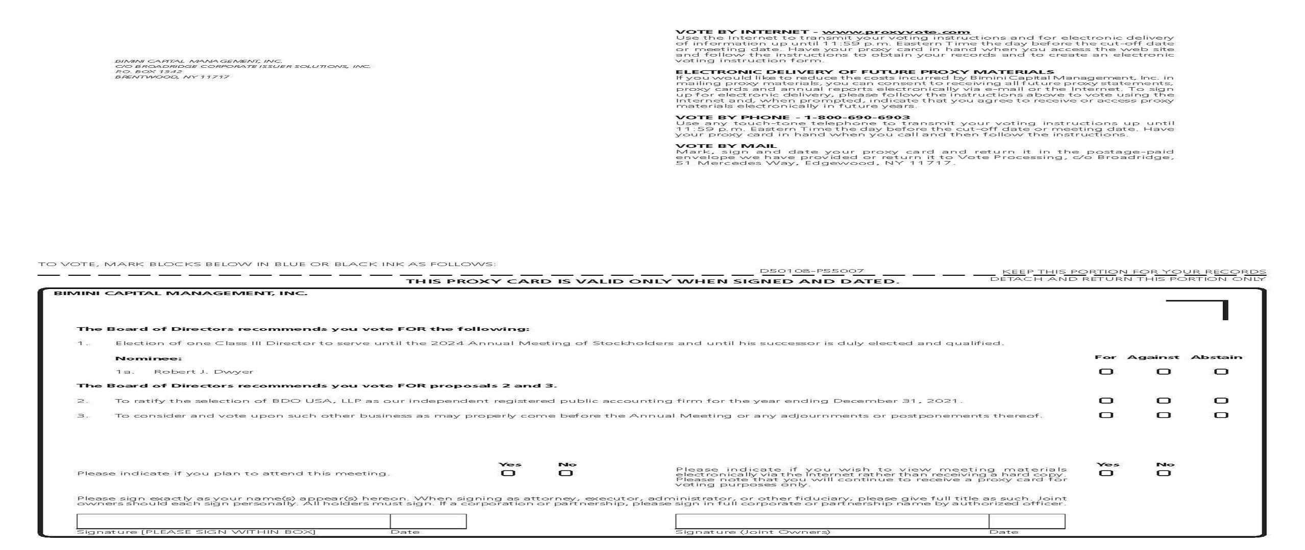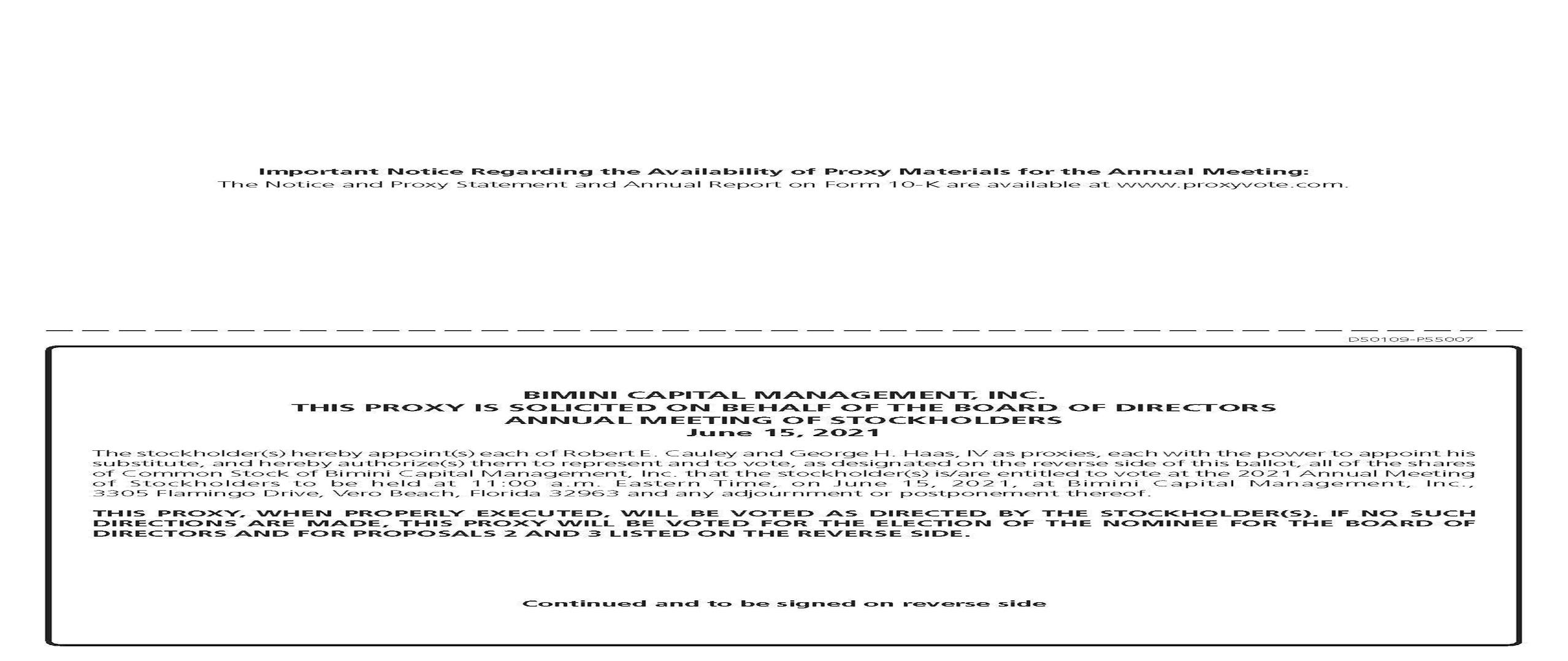 You are cordially invited to attend the 2021 Annual Meeting of Stockholders of Bimini Capital Management, Inc. to be held at 11:00 a.m., local time, on June 15, 2021, at the office of Bimini Capital Management, Inc.,