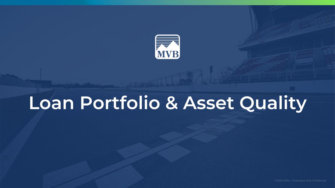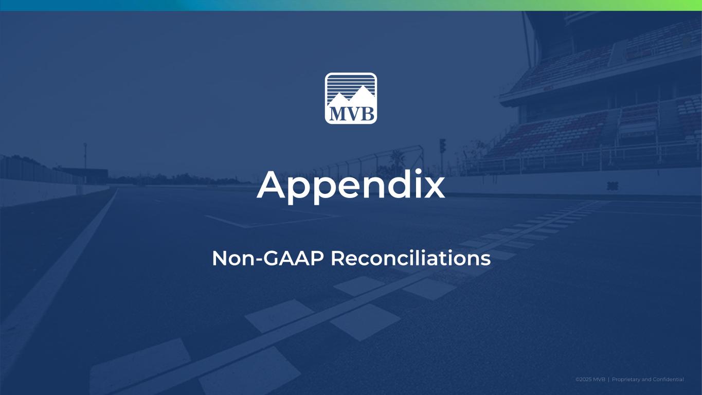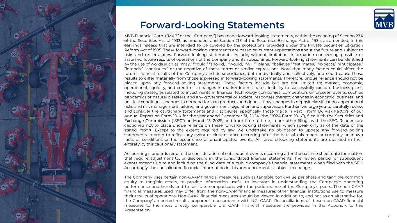 2 MVB Financial Corp. (“MVB” or the “Company”) has made forward-looking statements, within the meaning of Section 27A of the Securities Act of 1933, as amended, and Section 21E of the Securities Exchange Act of 1934, as amended, in this earnings release that are intended to be covered by the protections provided under the Private Securities Litigation Reform Act of 1995. These forward-looking statements are based on current expectations about the future and subject to risks and uncertainties. Forward-looking statements include, without limitation, information concerning possible or assumed future results of operations of the Company and its subsidiaries. Forward-looking statements can be identified by the use of words such as “may,” “could,” “should,”, “would,” “will,” “plans,” “believes,” “estimates,” “expects,” “anticipates,” “intends,” “continues,” or the negative of those terms or similar expressions. Note that many factors could affect the future financial results of the Company and its subsidiaries, both individually and collectively, and could cause those results to differ materially from those expressed in forward-looking statements. Therefore, undue reliance should not be placed upon any forward-looking statements. Those factors include but are not limited to: market, economic, operational, liquidity, and credit risk; changes in market interest rates; inability to successfully execute business plans, including strategies related to investments in financial technology companies; competition; unforeseen events, such as pandemics or natural disasters, and any governmental or societal responses thereto, changes in economic, business, and political conditions; changes in demand for loan products and deposit flow; changes in deposit classifications, operational risks and risk management failures; and government regulation and supervision. Further, we urge you to carefully review and consider the cautionary statements and disclosures, specifically those made in Part I, Item 1A, Risk Factors, of our Annual Report on Form 10-K for the year ended December 31, 2024 (the “2024 Form 10-K”), filed with the Securities and Exchange Commission ("SEC") on March 13, 2025, and from time to time, in our other filings with the SEC. Readers are cautioned not to place undue reliance on these forward-looking statements, which speak only as of the date of the stated report. Except to the extent required by law, we undertake no obligation to update any forward-looking statements in order to reflect any event or circumstance occurring after the date of this report or currently unknown facts or conditions or the occurrence of unanticipated events. All forward-looking statements are qualified in their entirety by this cautionary statement. Accounting standards require the consideration of subsequent events occurring after the balance sheet date for matters that require adjustment to, or disclosure in, the consolidated financial statements. The review period for subsequent events extends up to and including the filing date of a public company’s financial statements when filed with the SEC. Accordingly, the consolidated financial information in this announcement is subject to change. The Company uses certain non-GAAP financial measures, such as tangible book value per share and tangible common equity to tangible assets, to provide information useful to investors in understanding the Company’s operating performance and trends and to facilitate comparisons with the performance of the Company’s peers. The non-GAAP financial measures used may differ from the non-GAAP financial measures other financial institutions use to measure their results of operations. Non-GAAP financial measures should be viewed in addition to, and not as an alternative for, the Company’s reported results prepared in accordance with U.S. GAAP. Reconciliations of these non-GAAP financial measures to the most directly comparable U.S. GAAP financial measures are provided in the Appendix to this Presentation. Forward-Looking Statements