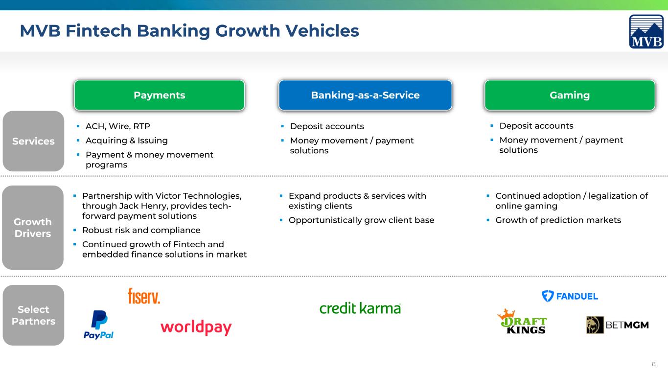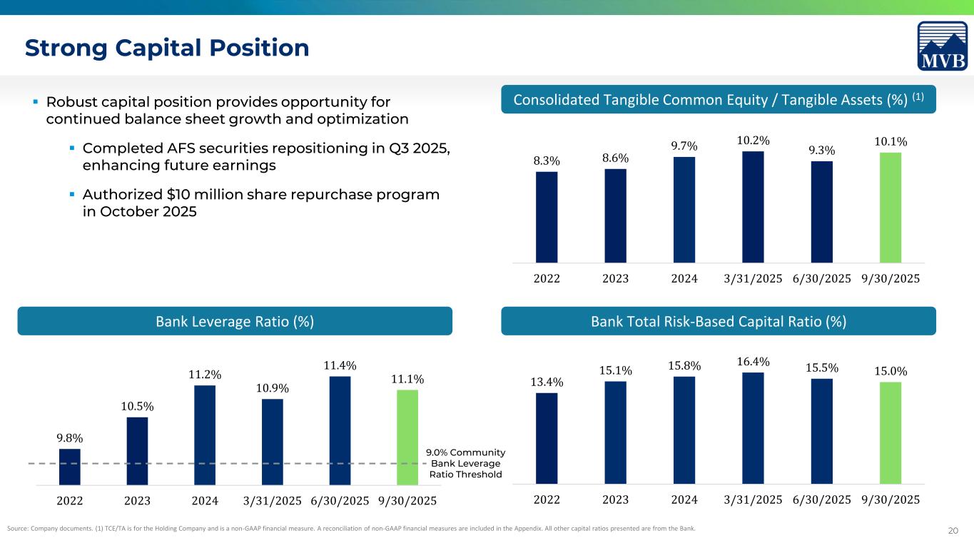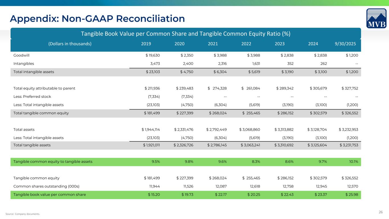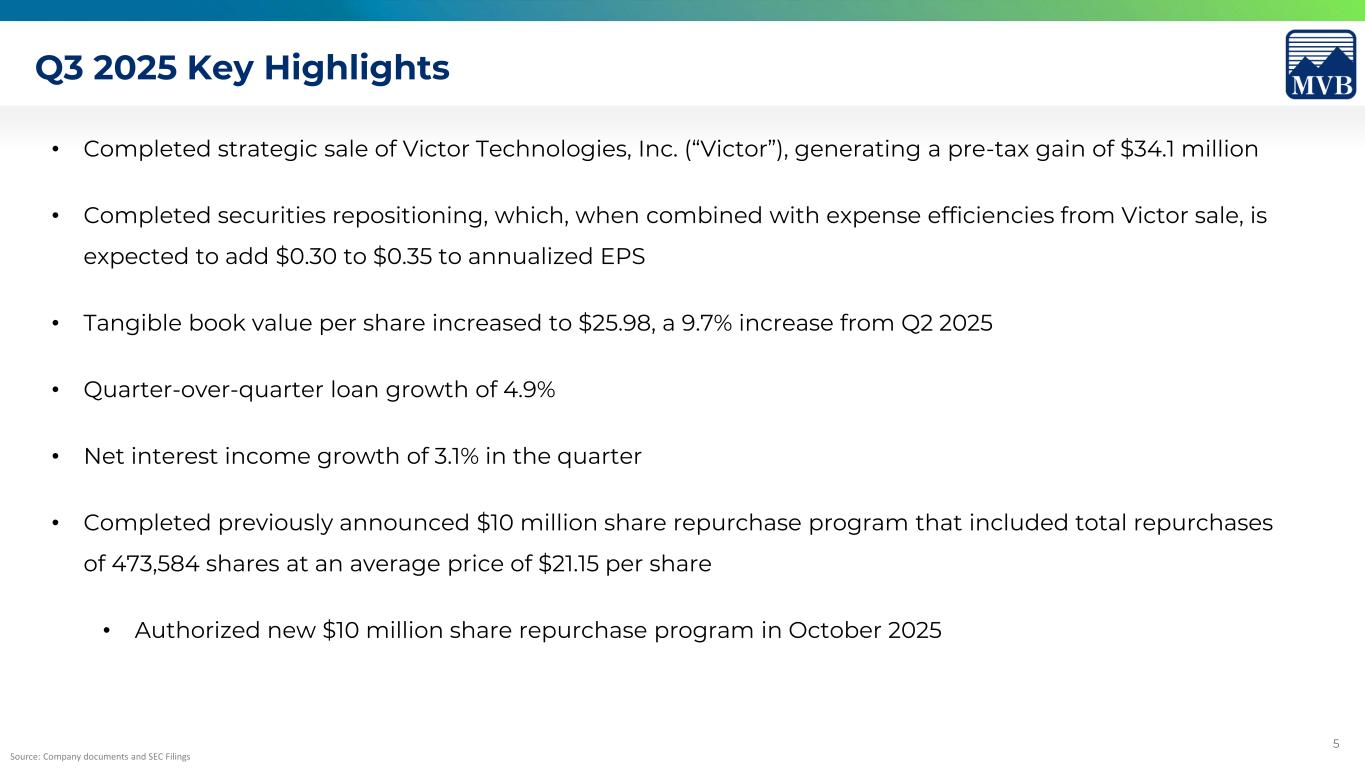 2 MVB Financial Corp. (“MVB” or the “Company”) has made forward-looking statements, within the meaning of Section 27A of the Securities Act of 1933, as amended, and Section 21E of the Securities Exchange Act of 1934, as amended, in this earnings release that are intended to be covered by the protections provided under the Private Securities Litigation Reform Act of 1995. These forward-looking statements are based on current expectations about the future and subject to risks and uncertainties. Forward-looking statements include, without limitation, information concerning possible or assumed future results of operations of the Company and its subsidiaries. Forward-looking statements can be identified by the use of words such as “may,” “could,” “should,”, “would,” “will,” “plans,” “believes,” “estimates,” “expects,” “anticipates,” “intends,” “continues,” or the negative of those terms or similar expressions. Note that many factors could affect the future financial results of the Company and its subsidiaries, both individually and collectively, and could cause those results to differ materially from those expressed in forward-looking statements. Therefore, undue reliance should not be placed upon any forward-looking statements. Those factors include but are not limited to: market, economic, operational, liquidity, and credit risk; changes in market interest rates; inability to successfully execute business plans, including strategies related to investments in financial technology companies; competition; unforeseen events, such as pandemics or natural disasters, and any governmental or societal responses thereto, changes in economic, business, and political conditions; changes in demand for loan products and deposit flow; changes in deposit classifications, operational risks and risk management failures; and government regulation and supervision. Further, we urge you to carefully review and consider the cautionary statements and disclosures, specifically those made in Part I, Item 1A, Risk Factors, of our Annual Report on Form 10-K for the year ended December 31, 2024 (the “2024 Form 10-K”), filed with the Securities and Exchange Commission ("SEC") on March 13, 2025, and from time to time, in our other filings with the SEC. Readers are cautioned not to place undue reliance on these forward-looking statements, which speak only as of the date of the stated report. Except to the extent required by law, we undertake no obligation to update any forward-looking statements in order to reflect any event or circumstance occurring after the date of this report or currently unknown facts or conditions or the occurrence of unanticipated events. All forward-looking statements are qualified in their entirety by this cautionary statement. Accounting standards require the consideration of subsequent events occurring after the balance sheet date for matters that require adjustment to, or disclosure in, the consolidated financial statements. The review period for subsequent events extends up to and including the filing date of a public company’s financial statements when filed with the SEC. Accordingly, the consolidated financial information in this announcement is subject to change. The Company uses certain non-GAAP financial measures, such as tangible book value per share and tangible common equity to tangible assets, to provide information useful to investors in understanding the Company’s operating performance and trends and to facilitate comparisons with the performance of the Company’s peers. The non-GAAP financial measures used may differ from the non-GAAP financial measures other financial institutions use to measure their results of operations. Non-GAAP financial measures should be viewed in addition to, and not as an alternative for, the Company’s reported results prepared in accordance with U.S. GAAP. Reconciliations of these non-GAAP financial measures to the most directly comparable U.S. GAAP financial measures are provided in the Appendix to this Presentation. Forward-Looking Statements