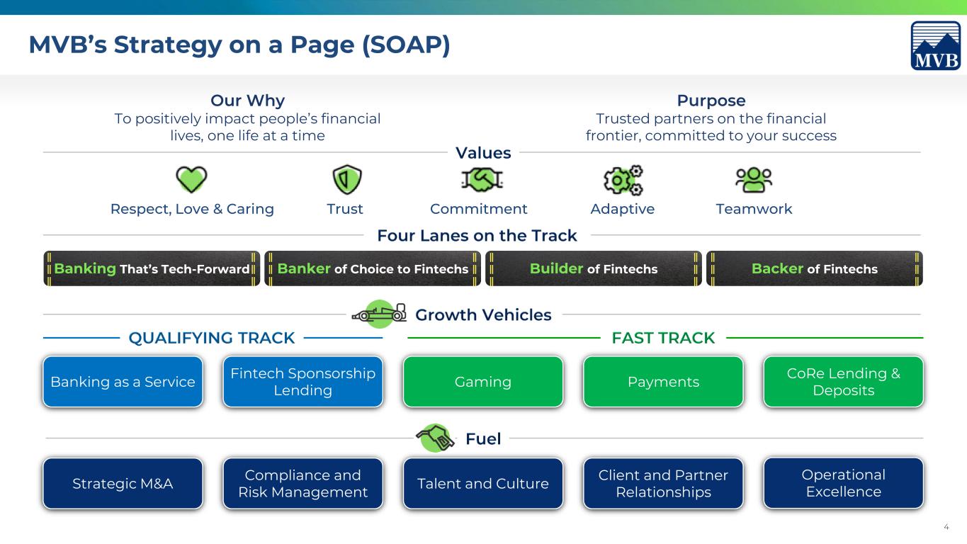 4 Trust Commitment TeamworkRespect, Love & Caring Adaptive Compliance and Risk Management Talent and Culture Operational Excellence Our Why To positively impact people’s financial lives, one life at a time Purpose Trusted partners on the financial frontier, committed to your success MVB’s Strategy on a Page (SOAP) Fintech Sponsorship Lending Strategic M&A Backer of FintechsBuilder of FintechsBanker of Choice to FintechsBanking That’s Tech-Forward Payments CoRe Lending & Deposits Client and Partner Relationships Banking as a Service Gaming