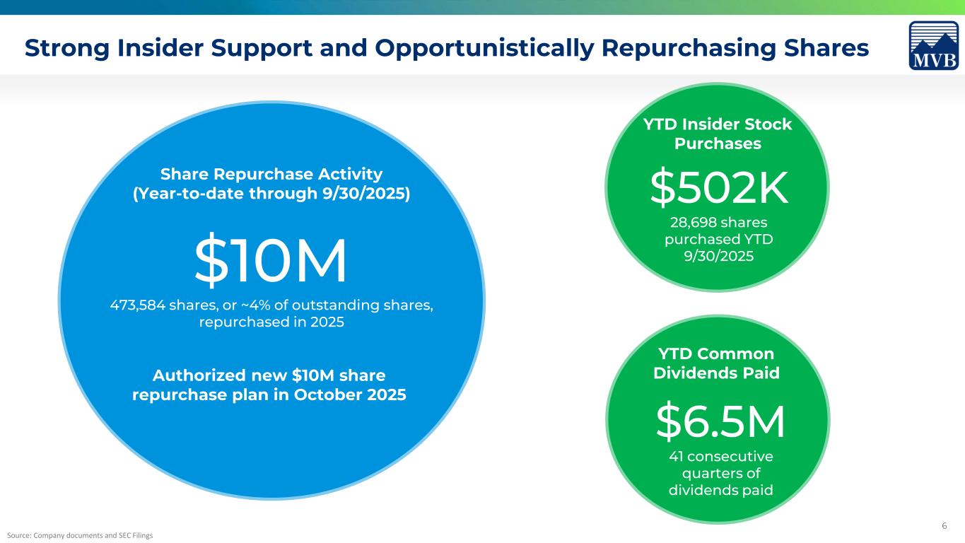 5 Source: Company documents and SEC Filings Q3 2025 Key Highlights • Completed strategic sale of Victor Technologies, Inc. (“Victor”), generating a pre-tax gain of $34.1 million • Completed securities repositioning, which, when combined with expense efficiencies from Victor sale, is expected to add $0.30 to $0.35 to annualized EPS • Tangible book value per share increased to $25.98, a 9.7% increase from Q2 2025 • Quarter-over-quarter loan growth of 4.9% • Net interest income growth of 3.1% in the quarter • Completed previously announced $10 million share repurchase program that included total repurchases of 473,584 shares at an average price of $21.15 per share • Authorized new $10 million share repurchase program in October 2025