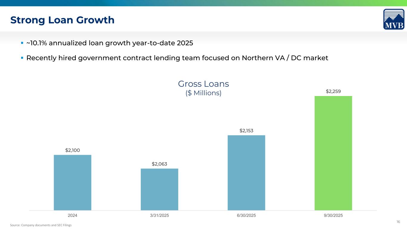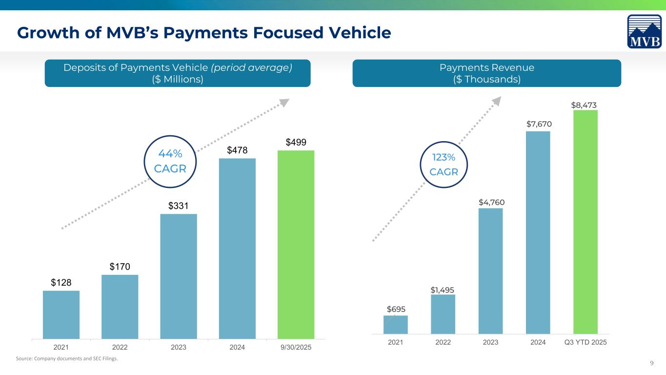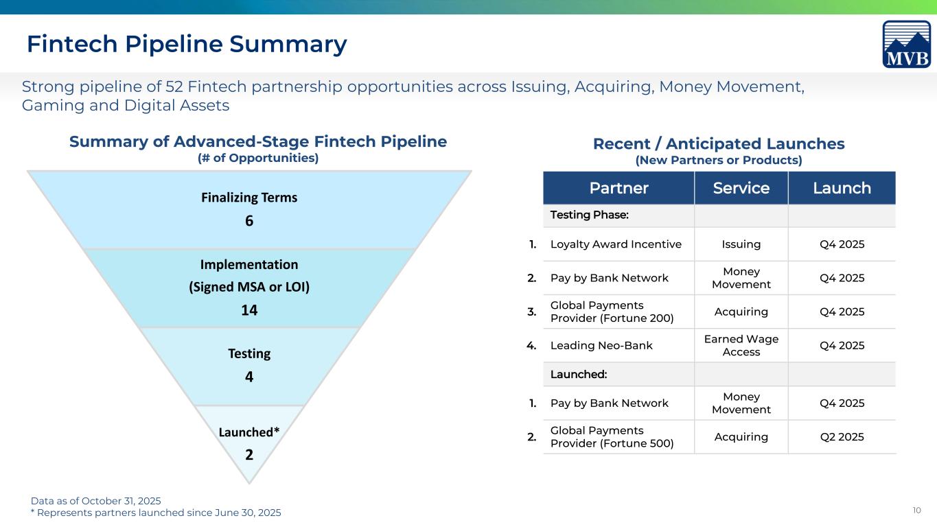 9 Growth of MVB’s Payments Focused Vehicle Source: Company documents and SEC Filings. $128 $170 $331 $478 $499 2021 2022 2023 2024 9/30/2025 44% CAGR Payments Revenue ($ Thousands) Deposits of Payments Vehicle (period average) ($ Millions) $695 $1,495 $4,760 $7,670 $8,473 2021 2022 2023 2024 Q3 YTD 2025 123% CAGR