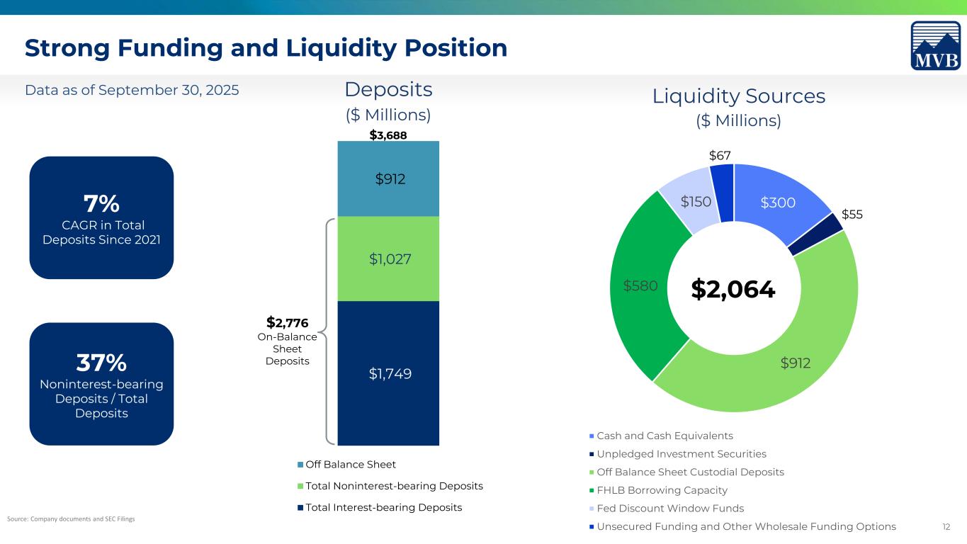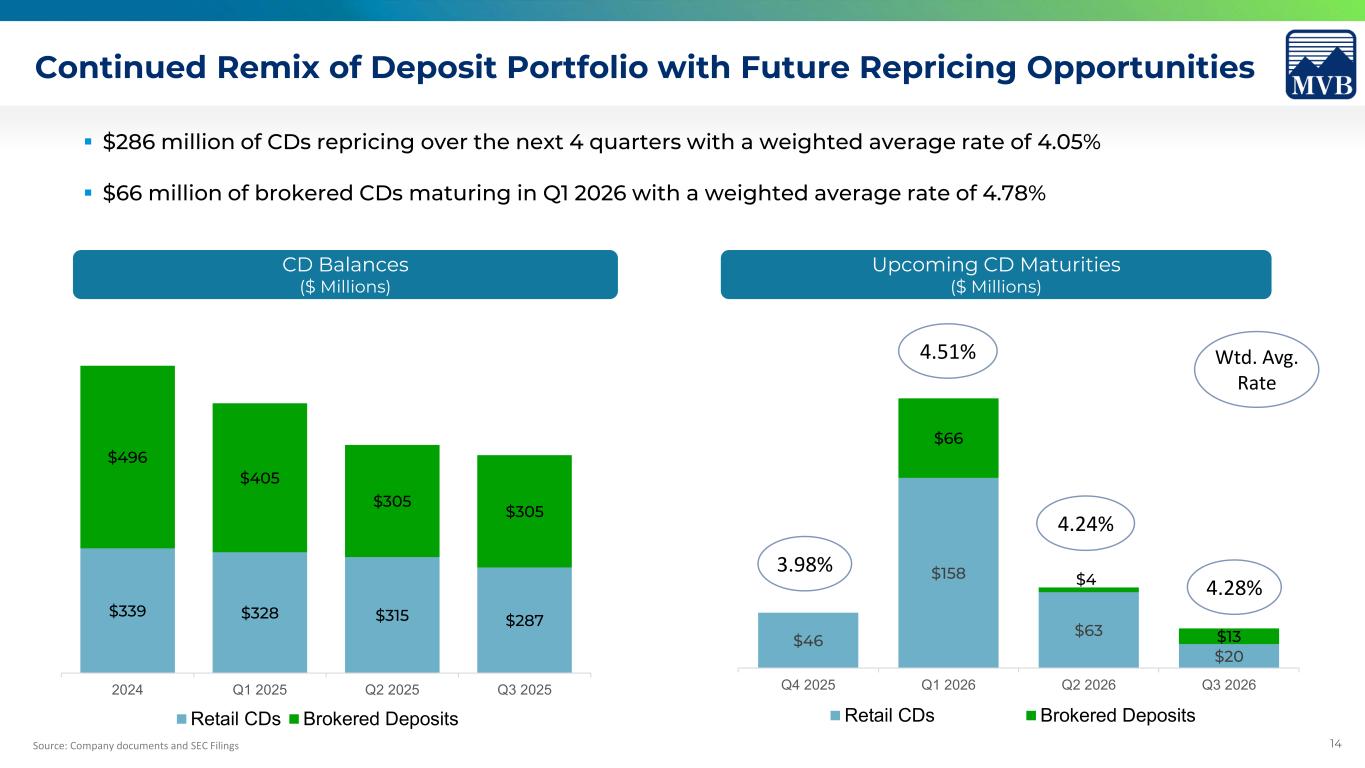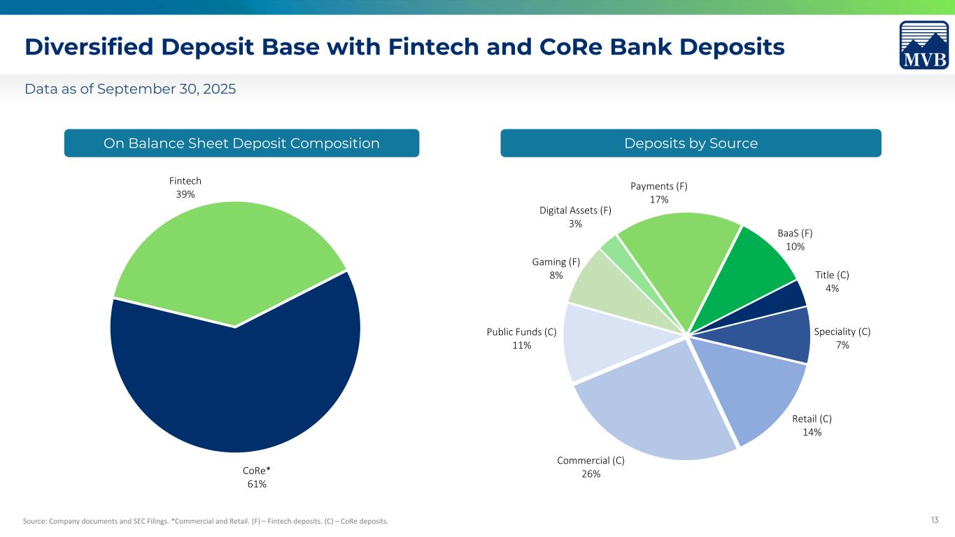 12 Source: Company documents and SEC Filings $1,749 $1,027 $912 Off Balance Sheet Total Noninterest-bearing Deposits Total Interest-bearing Deposits $3,688 Deposits ($ Millions) Strong Funding and Liquidity Position $300 $55 $912 $580 $150 $67 Liquidity Sources ($ Millions) Cash and Cash Equivalents Unpledged Investment Securities Off Balance Sheet Custodial Deposits FHLB Borrowing Capacity Fed Discount Window Funds Unsecured Funding and Other Wholesale Funding Options $2,064 $2,776 On-Balance Sheet Deposits 7% CAGR in Total Deposits Since 2021 37% Noninterest-bearing Deposits / Total Deposits Data as of September 30, 2025