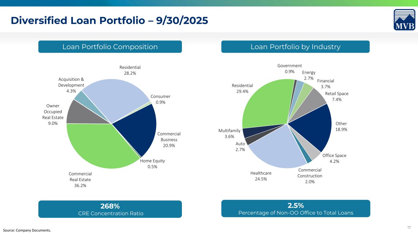 16 Strong Loan Growth Source: Company documents and SEC Filings $2,100 $2,063 $2,153 $2,259 2024 3/31/2025 6/30/2025 9/30/2025 Gross Loans ($ Millions) ▪ ~10.1% annualized loan growth year-to-date 2025 ▪ Recently hired government contract lending team focused on Northern VA / DC market