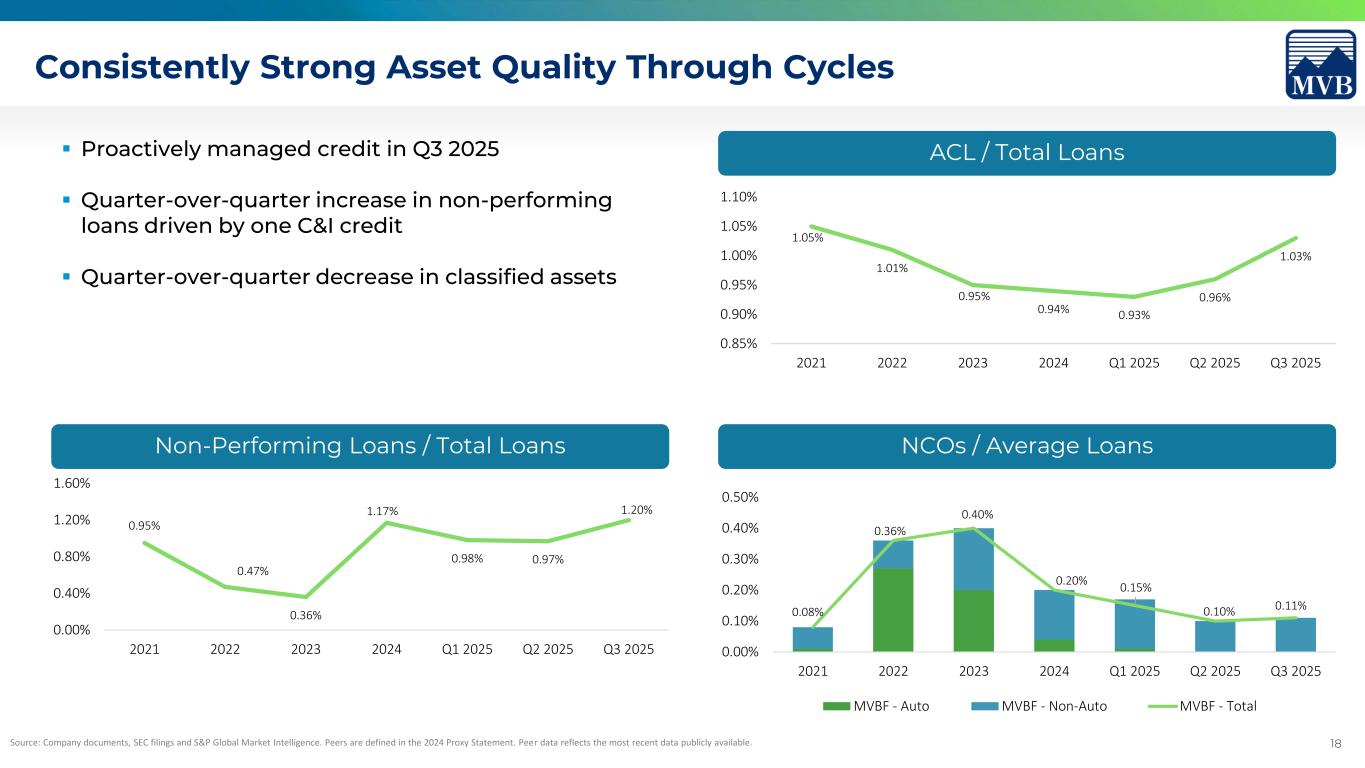 18 0.95% 0.47% 0.36% 1.17% 0.98% 0.97% 1.20% 0.00% 0.40% 0.80% 1.20% 1.60% 2021 2022 2023 2024 Q1 2025 Q2 2025 Q3 2025 Non-Performing Loans / Total Loans 0.08% 0.36% 0.40% 0.20% 0.15% 0.10% 0.11% 0.00% 0.10% 0.20% 0.30% 0.40% 0.50% 2021 2022 2023 2024 Q1 2025 Q2 2025 Q3 2025 MVBF - Auto MVBF - Non-Auto MVBF - Total NCOs / Average Loans Source: Company documents, SEC filings and S&P Global Market Intelligence. Peers are defined in the 2024 Proxy Statement. Peer data reflects the most recent data publicly available. 1.05% 1.01% 0.95% 0.94% 0.93% 0.96% 1.03% 0.85% 0.90% 0.95% 1.00% 1.05% 1.10% 2021 2022 2023 2024 Q1 2025 Q2 2025 Q3 2025 ACL / Total Loans Consistently Strong Asset Quality Through Cycles ▪ Proactively managed credit in Q3 2025 ▪ Quarter-over-quarter increase in non-performing loans driven by one C&I credit ▪ Quarter-over-quarter decrease in classified assets