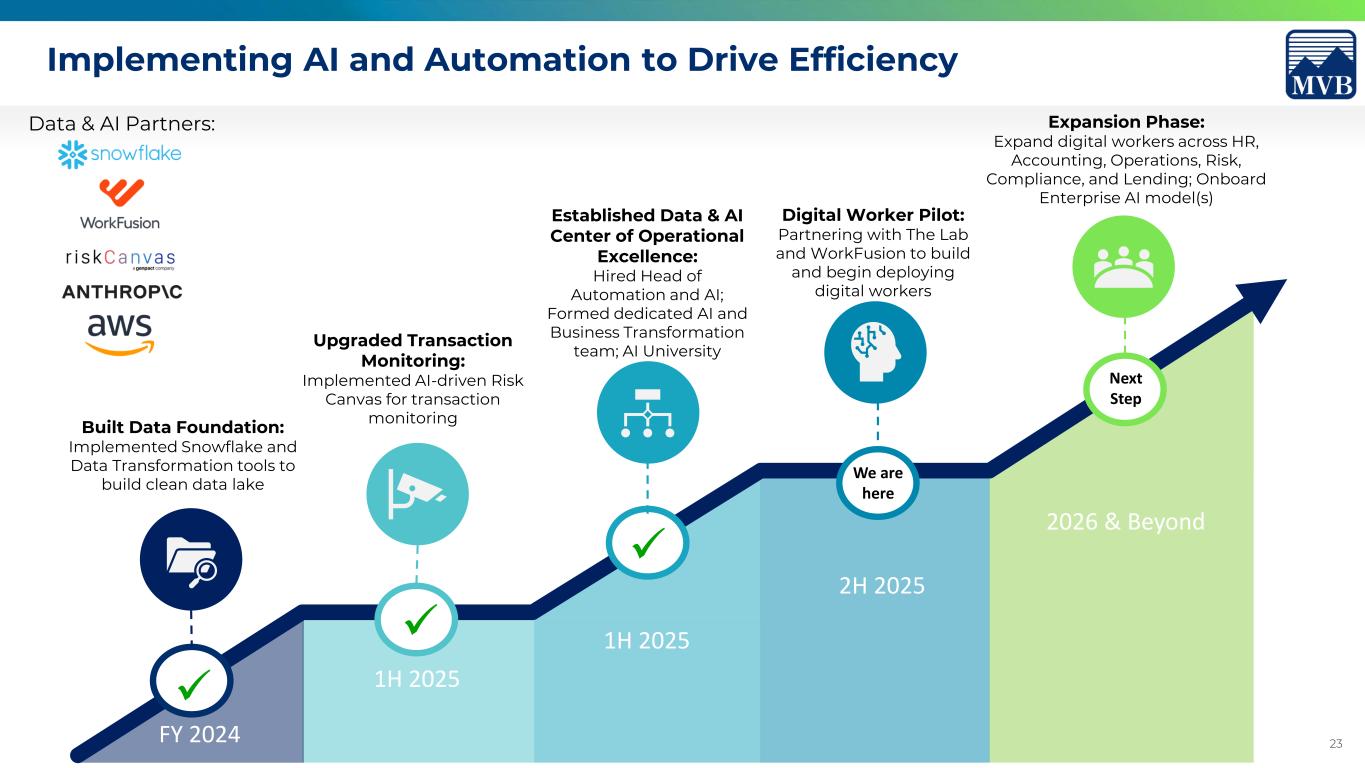 24 Risk Management Strength and Capabilities Teams 2021 2022 2023 2024* 2025 Q1 Q2 Q3 Q4 Q1 Q2 Q3 Q4 Q1 Q2 Q3 Q4 Q1 Q2 Q3 Q4 Q1 Q2 Q3 Risk Management 10 12 11 14 16 22 23 24 24 24 30 27 32 35 30 25 25 27 27 BSA/AML (MVB) 17 19 18 18 18 18 18 18 23 31 50 59 50 60 62 60 56 61 59 BSA/AML (Co-sourced FTEs) 5 12 15 17 19 23 22 21 16 17 17 17 41 60 34 27 33 27 24 Consumer Compliance 3 3 3 3 3 4 5 5 6 6 7 7 7 8 8 8 9 9 7 Total Risk Staffing: 35 46 47 52 56 67 68 68 69 78 104 110 130 160 134 120 123 124 117 0 20 40 60 80 100 120 140 160 180 Q1 2021 Q2 2021 Q3 2021 Q4 2021 Q1 2022 Q2 2022 Q3 2022 Q4 2022 Q1 2023 Q2 2023 Q3 2023 Q4 2023 Q1 2024 Q2 2024 Q3 2024 Q4 2024 Q1 2025 Q2 2025 Q3 2025 Risk Management BSA/AML (MVB) BSA/AML (Co-sourced FTEs) Consumer Compliance 35 117 * Included various short-term initiatives and projects implemented throughout the year