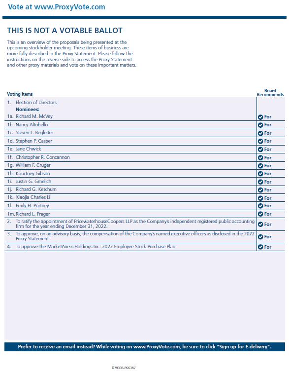 Vote at www.ProxyVote.com THIS IS NOT A VOTABLE BALLOT This is an overview of the proposals being presented at the upcoming stockholder meeting. These items of business are more fully described in the Proxy Statement. Please follow the instructions on the reverse side to access the Proxy Statement and other proxy materials and vote on these important matters. Board Recommends Voting Items 1. Election of Directors Nominees: 1a. Richard M. McVey For 1b. Nancy Altobello For 1c. Steven L. Begleiter For 1d. Stephen P. Casper For 1e. Jane Chwick For 1f. Christopher R. Concannon For 1g. William F. Cruger For 1h. Kourtney Gibson For 1i. Justin G. Gmelich For 1j. Richard G. Ketchum For 1k. Xiaojia Charles Li For 1l. Emily H. Portney For 1m. Richard L. Prager For 2. To ratify the appointment of PricewaterhouseCoopers LLP as the Company’s independent registered public accounting firm for the year ending December 31, 2022. For 3. To approve, on an advisory basis, the compensation of the Company’s named executive officers as disclosed in the 2022 Proxy Statement. For 4. To approve the MarketAxess Holdings Inc. 2022 Employee Stock Purchase Plan. For Prefer to receive an email instead? While voting on www.ProxyVote.com, be sure to click “Sign up for E-delivery”. D79335-P66387