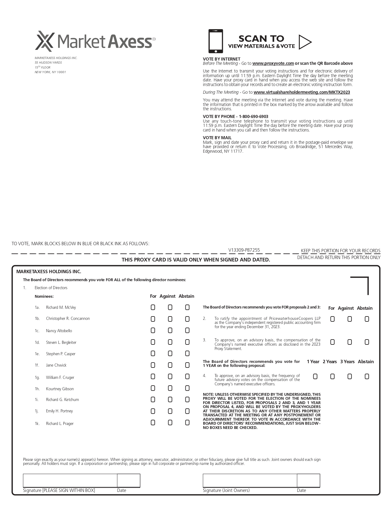 MARKETAXESS HOLDINGS INC. 55 HUDSON YARDS 15TH FLOOR NEW YORK, NY 10001 SCAN TO VIEW MATERIALS & VOTE VOTE BY INTERNET Before The Meeting - Go to www.proxyvote.com or scan the QR Barcode above Use the Internet to transmit your voting instructions and for electronic delivery of information up until 11:59 p.m. Eastern Daylight Time the day before the meeting date. Have your proxy card in hand when you access the web site and follow the instructions to obtain your records and to create an electronic voting instruction form. During The Meeting - Go to www.virtualshareholdermeeting.com/MKTX2023 You may attend the meeting via the Internet and vote during the meeting. Have the information that is printed in the box marked by the arrow available and follow the instructions. VOTE BY PHONE - 1-800-690-6903 Use any touch-tone telephone to transmit your voting instructions up until 11:59 p.m. Eastern Daylight Time the day before the meeting date. Have your proxy card in hand when you call and then follow the instructions. VOTE BY MAIL Mark, sign and date your proxy card and return it in the postage-paid envelope we have provided or return it to Vote Processing, c/o Broadridge, 51 Mercedes Way, Edgewood, NY 11717. TO VOTE, MARK BLOCKS BELOW IN BLUE OR BLACK INK AS FOLLOWS: KEEP THIS PORTION FOR YOUR RECORDS DETACH AND RETURN THIS PORTION ONLY THIS PROXY CARD IS VALID ONLY WHEN SIGNED AND DATED. V13309-P87255 MARKETAXESS HOLDINGS INC. The Board of Directors recommends you vote FOR ALL of the following director nominees: 1. Election of Directors Nominees: 1d. Steven L. Begleiter 1a. Richard M. McVey 1c. Nancy Altobello 1b. Christopher R. Concannon 1e. Stephen P. Casper 1f. Jane Chwick 1j. Emily H. Portney 1k. Richard L. Prager 1g. William F. Cruger 1i. Richard G. Ketchum 1h. Kourtney Gibson For Against Abstain The Board of Directors recommends you vote FOR proposals 2 and 3: 2. To ratify the appointment of PricewaterhouseCoopers LLP as the Company's independent registered public accounting firm for the year ending December 31, 2023. 3. To approve, on an advisory basis, the compensation of the Company's named executive officers as disclosed in the 2023 Proxy Statement. The Board of Directors recommends you vote for 1 YEAR on the following proposal: 4. To approve, on an advisory basis, the frequency of future advisory votes on the compensation of the Company's named executive officers. NOTE: UNLESS OTHERWISE SPECIFIED BY THE UNDERSIGNED, THIS PROXY WILL BE VOTED FOR THE ELECTION OF THE NOMINEES FOR DIRECTOR LISTED, FOR PROPOSALS 2 AND 3, AND 1 YEAR ON PROPOSAL 4, AND WILL BE VOTED BY THE PROXYHOLDERS AT THEIR DISCRETION AS TO ANY OTHER MATTERS PROPERLY TRANSACTED AT THE MEETING OR AT ANY POSTPONEMENT OR ADJOURNMENT THEREOF. TO VOTE IN ACCORDANCE WITH THE BOARD OF DIRECTORS' RECOMMENDATIONS, JUST SIGN BELOW - NO BOXES NEED BE CHECKED For Against Abstain 1 Year 2 Years 3 Years Abstain Please sign exactly as your name(s) appear(s) hereon. When signing as attorney, executor, administrator, or other fiduciary, please give full title as such. Joint owners should each sign personally. All holders must sign. If a corporation or partnership, please sign in full corporate or partnership name by authorized officer. Signature [PLEASE SIGN WITHIN BOX] Date Signature (Joint Owners) Date Market Axess ®