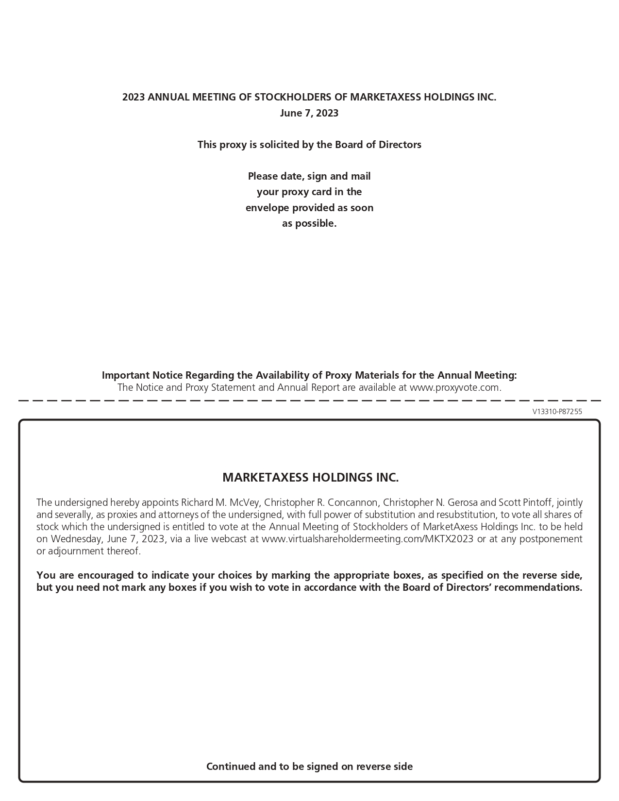 2023 ANNUAL MEETING OF STOCKHOLDERS OF MARKETAXESS HOLDINGS INC. June 7, 2023 This proxy is solicited by the Board of Directors Please date, sign and mail your proxy card in the envelope provided as soon as possible. Important Notice Regarding the Availability of Proxy Materials for the Annual Meeting: The Notice and Proxy Statement and Annual Report are available at www.proxyvote.com. V13310-P87255 MARKETAXESS HOLDINGS INC. The undersigned hereby appoints Richard M. McVey, Christopher R. Concannon, Christopher N. Gerosa and Scott Pintoff, jointly and severally, as proxies and attorneys of the undersigned, with full power of substitution and resubstitution, to vote all shares of stock which the undersigned is entitled to vote at the Annual Meeting of Stockholders of Market Axess Holdings Inc. to be held on Wednesday, June 7, 2023, via a live webcast at www.virtualshareholdermeeting.com/MKTX2023 or at any postponement or adjournment thereof. You are encouraged to indicate your choices by marking the appropriate boxes, as specified on the reverse side, but you need not mark any boxes if you wish to vote in accordance with the Board of Directors’ recommendations. Continued and to be signed on reverse side