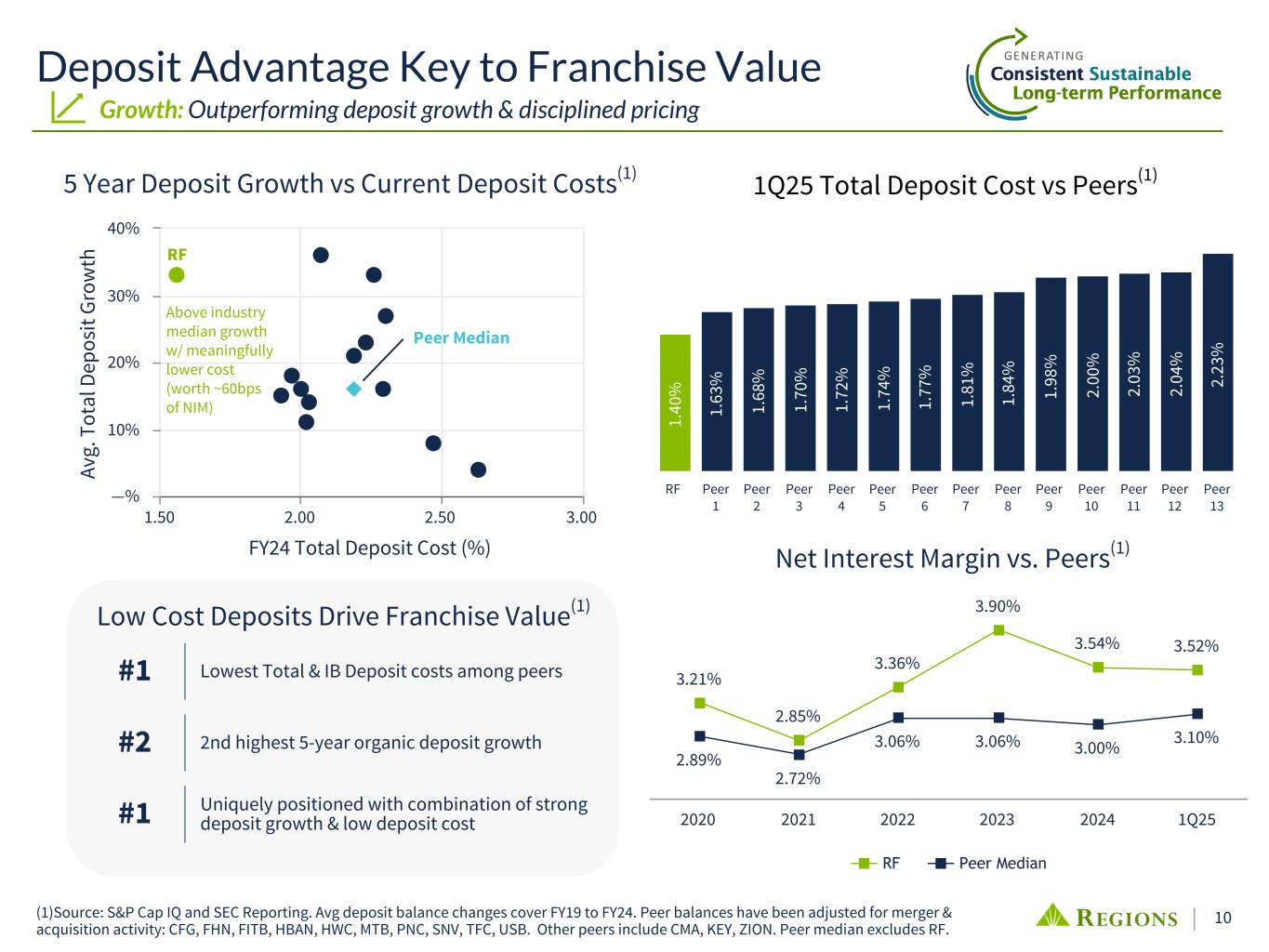 9 Leading Growth Profile Attractive Footprint and Strong Brand Presence Growth: Home field advantage in the southeast Regions HQ Retail Branch Footprint Specialized Lending Nationwide Winning in Core Markets Building trust & serving clients for over 170 years Strong Profitability/Returns Supported by: ☑ Low Cost Core Deposits ☑ Strong Brand ☑ Loyal Customer Base ☑ Employer / Bank of Choice ~70% Top 5 market share in ~70% of MSAs across 15-state footprint(1) 86% 86% of deposits reside in 7 states: Alabama, Tennessee, Florida, Louisiana, Mississippi, Georgia, Arkansas ~$5,300 Average consumer NIB account balance(3) 7 of 8 Unemployment rates in 7 of our top 8 deposit states remain below the national average(2) 3.5% Regions' deposit weighted population growth by MSA for 2024-2029 is 3.5% vs. national average of 2.4%(1) 16 of 25 16 of Regions' top 25(1) MSAs are projected to grow faster than the U.S. national average (1) Source: S&P Cap IQ. Top 25 market share as defined by deposit dollars - FDIC as of 6/30/2024; pro-forma for announced M&A transactions as of 2/18/2025. Top 5 share based on MSA and non-MSA counties. S&P's demographic data is provided by Claritas based primarily on U.S. Census data. (2) Source: U.S. Bureau of Labor Statistics. (3) Based on 1Q25 average balances.
