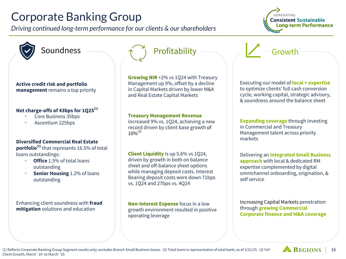 15 Consumer Banking Group Driving growth and customer engagement through strategic investments Industry leader in deposit cost while showing modest balance growth ahead of peers in 1Q25; Continued focus on preserving advantageous deposit mix Home Equity production growth of 25% vs 1Q24 driven by initiatives to capture improving consumer interest Credit Card spend YoY growth of 5% in 1Q25 driven by account growth and higher spend per account; Continued strength of credit 1Q25 Average Loan growth relatively stable YoY and vs 4Q24 Continued strength in expense management (1) J.D. Power 2024 U.S. Banking Online Satisfaction Study; among banks with $70B to $200B in deposits, which measures customer satisfaction with financial institutions’ website experience for banking account management. Visit jdpower.com/awards for more details. (2) iOS app store rating. Regions Bank is the highest-rated bank in Forbes’ newest list of the top 300 U.S. companies for customer service J.D. Power(1) ranked Regions Bank #1 in customer satisfaction among regional bank online experiences 4 of the last 5 years Regions Bank ranked 2nd in American Banker’s list of top banks by reputation Regions Bank has been recognized as a Fannie Mae STARTM performer for the 8th consecutive year Top-decile in customer loyalty per Gallup 4.9 out of 5 Mobile app rating(2) Delivering Solid Customer Satisfaction & Loyalty Growing and retaining primary relationships by reskilling ~300 bankers to focus on small business opportunities and reallocating ~300 bankers to align talent depth with highest opportunity across key customer segments Recruiting and growing Mortgage producers in key growth markets by an incremental ~50 mortgage loan officers Delivering on localized strategies leveraging key sponsorships and campus activations including conducting ~6k financial education workshops in 1Q25 On-going investment in Branch Network to maintain and expand customer relationships Strategic Investments Across The Business Continuing to Deliver Strong Results