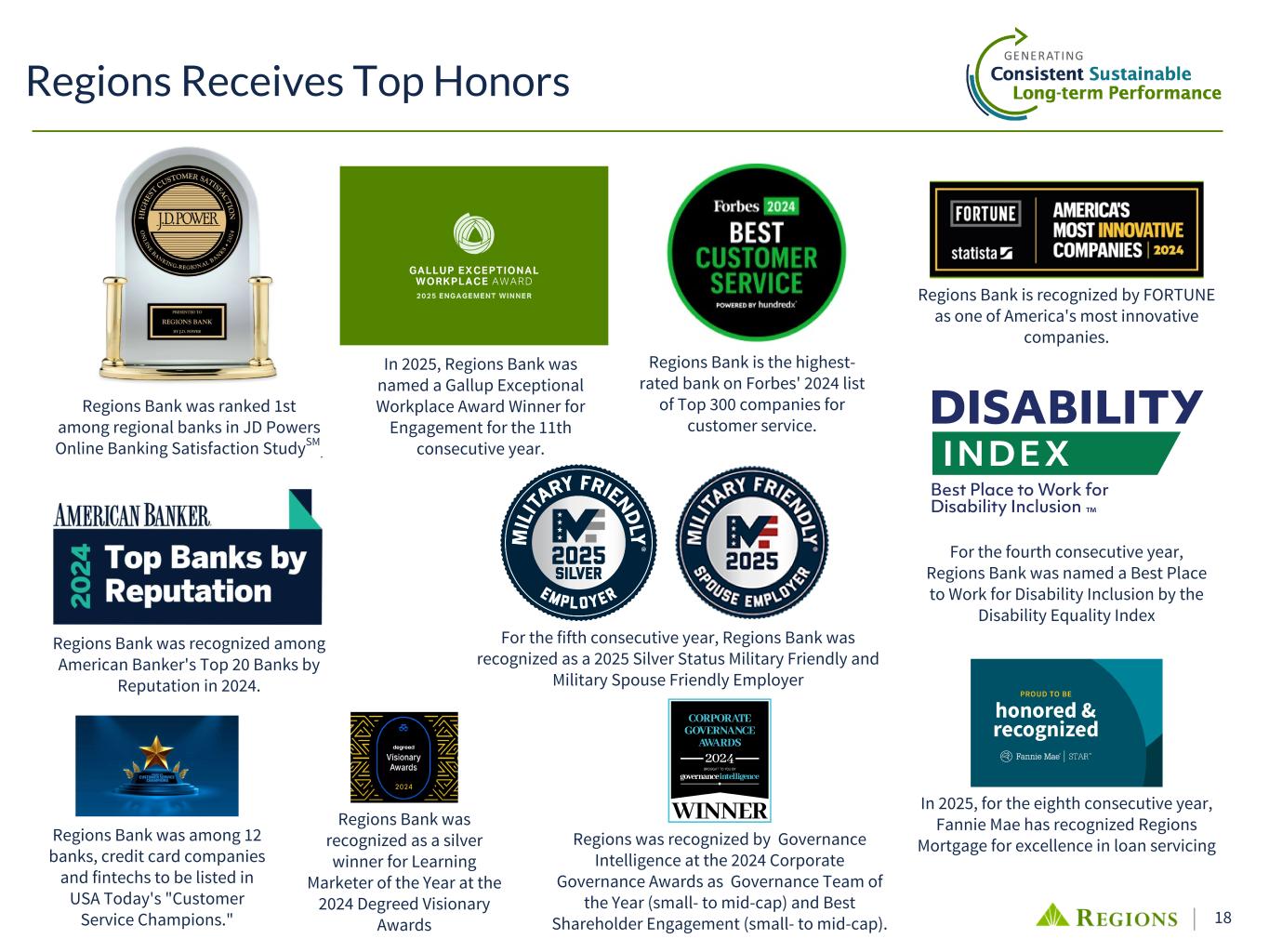 18 Regions Receives Top Honors For the fifth consecutive year, Regions Bank was recognized as a 2025 Silver Status Military Friendly and Military Spouse Friendly Employer In 2025, Regions Bank was named a Gallup Exceptional Workplace Award Winner for Engagement for the 11th consecutive year. For the fourth consecutive year, Regions Bank was named a Best Place to Work for Disability Inclusion by the Disability Equality Index Regions Bank is the highest- rated bank on Forbes' 2024 list of Top 300 companies for customer service. Regions Bank is recognized by FORTUNE as one of America's most innovative companies. Regions Bank was ranked 1st among regional banks in JD Powers Online Banking Satisfaction StudySM . Regions Bank was recognized among American Banker's Top 20 Banks by Reputation in 2024. Regions Bank was among 12 banks, credit card companies and fintechs to be listed in USA Today's "Customer Service Champions." Regions was recognized by Governance Intelligence at the 2024 Corporate Governance Awards as Governance Team of the Year (small- to mid-cap) and Best Shareholder Engagement (small- to mid-cap). Regions Bank was recognized as a silver winner for Learning Marketer of the Year at the 2024 Degreed Visionary Awards In 2025, for the eighth consecutive year, Fannie Mae has recognized Regions Mortgage for excellence in loan servicing
