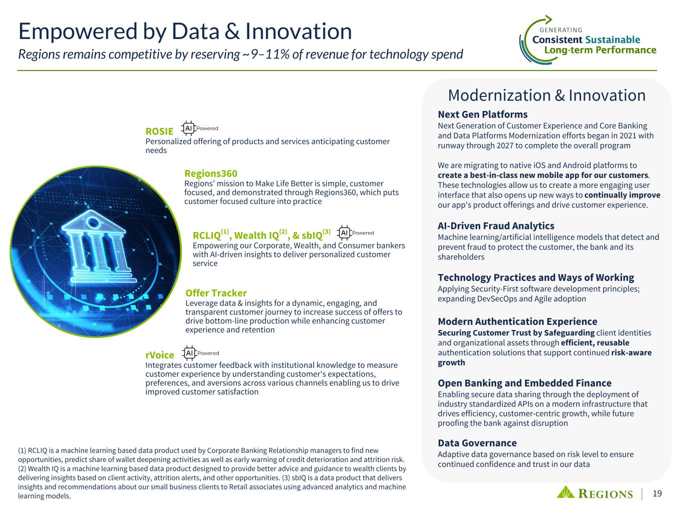 19 Empowered by Data & Innovation Regions remains competitive by reserving ~9–11% of revenue for technology spend Next Gen Platforms Next Generation of Customer Experience and Core Banking and Data Platforms Modernization efforts began in 2021 with runway through 2027 to complete the overall program We are migrating to native iOS and Android platforms to create a best-in-class new mobile app for our customers. These technologies allow us to create a more engaging user interface that also opens up new ways to continually improve our app's product offerings and drive customer experience. AI-Driven Fraud Analytics Machine learning/artificial intelligence models that detect and prevent fraud to protect the customer, the bank and its shareholders Technology Practices and Ways of Working Applying Security-First software development principles; expanding DevSecOps and Agile adoption Modern Authentication Experience Securing Customer Trust by Safeguarding client identities and organizational assets through efficient, reusable authentication solutions that support continued risk-aware growth Open Banking and Embedded Finance Enabling secure data sharing through the deployment of industry standardized APIs on a modern infrastructure that drives efficiency, customer-centric growth, while future proofing the bank against disruption Data Governance Adaptive data governance based on risk level to ensure continued confidence and trust in our data Modernization & Innovation ROSIE Personalized offering of products and services anticipating customer needs Regions360 Regions’ mission to Make Life Better is simple, customer focused, and demonstrated through Regions360, which puts customer focused culture into practice RCLIQ(1), Wealth IQ(2), & sbIQ(3) Empowering our Corporate, Wealth, and Consumer bankers with AI-driven insights to deliver personalized customer service Offer Tracker Leverage data & insights for a dynamic, engaging, and transparent customer journey to increase success of offers to drive bottom-line production while enhancing customer experience and retention rVoice Integrates customer feedback with institutional knowledge to measure customer experience by understanding customer's expectations, preferences, and aversions across various channels enabling us to drive improved customer satisfaction (1) RCLIQ is a machine learning based data product used by Corporate Banking Relationship managers to find new opportunities, predict share of wallet deepening activities as well as early warning of credit deterioration and attrition risk. (2) Wealth IQ is a machine learning based data product designed to provide better advice and guidance to wealth clients by delivering insights based on client activity, attrition alerts, and other opportunities. (3) sbIQ is a data product that delivers insights and recommendations about our small business clients to Retail associates using advanced analytics and machine learning models.