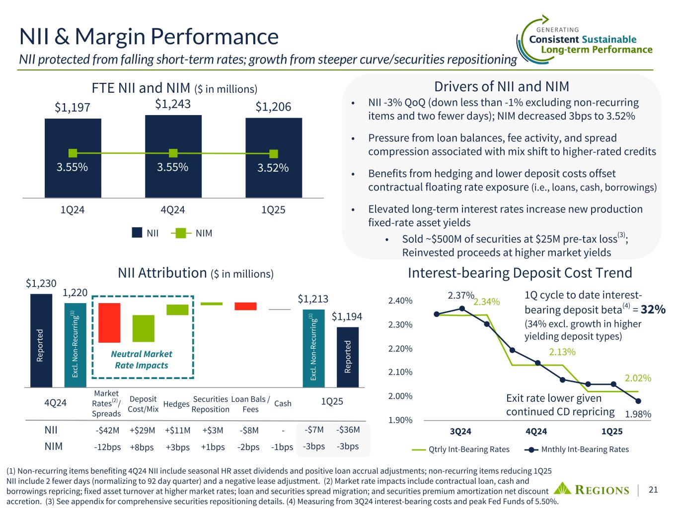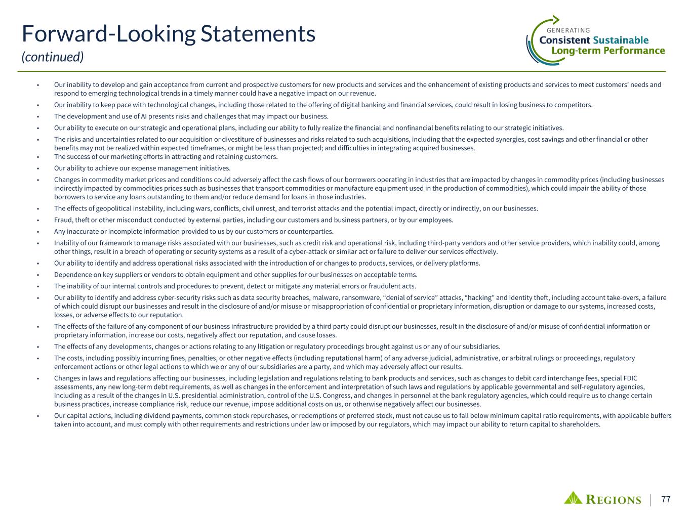 78 • Our ability to comply with stress testing and capital planning requirements (as part of the CCAR process or otherwise) may continue to require a significant investment of our managerial resources due to the importance of such tests and requirements. • Our ability to comply with applicable capital and liquidity requirements (including, among other things, the Basel III Rules), including our ability to generate capital internally or raise capital on favorable terms, and if we fail to meet requirements, our financial condition and market perceptions of us could be negatively impacted. • Our ability to recruit and retain talented and experienced personnel to assist in the development, management and operation of our products and services may be affected by changes in laws and regulations in effect from time to time. • Our ability to receive dividends from our subsidiaries, in particular Regions Bank, could affect our liquidity and ability to pay dividends to shareholders. • Fluctuations in the price of our common stock and inability to complete stock repurchases in the time frame and/or on the terms anticipated. • The effects of anti-takeover laws and exclusive forum provision in our certificate of incorporation and bylaws. • The effect of new tax legislation and/or interpretation of existing tax law, which may impact our earnings, capital ratios and our ability to return capital to shareholders. • Changes in accounting policies or procedures as may be required by the FASB or other regulatory agencies could materially affect our financial statements and how we report those results, and expectations and preliminary analyses relating to how such changes will affect our financial results could prove incorrect. • Any impairment of our goodwill or other intangibles, any repricing of assets or any adjustment of valuation allowances on our deferred tax assets due to changes in tax law, adverse changes in the economic environment declining operations of the reporting unit or other factors. • The effects of man-made and natural disasters, including fires, floods, droughts, tornadoes, hurricanes and environmental damage (especially in the Southeastern United States), which may negatively affect our operations and/or our loan portfolios and increase our cost of conducting business. The severity and frequency of future earthquakes, fires, hurricanes, tornadoes, droughts, floods and other weather-related events are difficult to predict and may be exacerbated by global climate change. • The impact of pandemics on our businesses, operations and financial results and conditions. The duration and severity of any pandemic as well as government actions or other restrictions in connection with such events could disrupt the global economy, adversely affect our capital and liquidity position, impair the ability of borrowers to repay outstanding loans and increase our allowance for credit losses, impair collateral values and result in lost revenue or additional expenses. • The effects of any damage to our reputation resulting from developments related to any of the items identified above. • Other risks identified from time to time in reports that we file with the SEC. The foregoing list of factors is not exhaustive. For discussion of these and other factors that may cause actual results to differ from expectations, look under the captions “Forward-Looking Statements” and “Risk Factors” in Regions’ Annual Report on Form 10-K for the year ended December 31, 2024 and in Regions’ subsequent filings with the SEC. You should not place undue reliance on any forward-looking statements, which speak only as of the date made. Factors or events that could cause our actual results to differ may emerge from time to time, and it is not possible to predict all of them. We assume no obligation and do not intend to update or revise any forward-looking statements that are made from time to time, either as a result of future developments, new information or otherwise, except as may be required by law. Regions’ Investor Relations contact is Dana Nolan at (205) 264-7040; Regions’ Media contact is Jeremy King at (205) 264-4551. Forward-Looking Statements (continued)