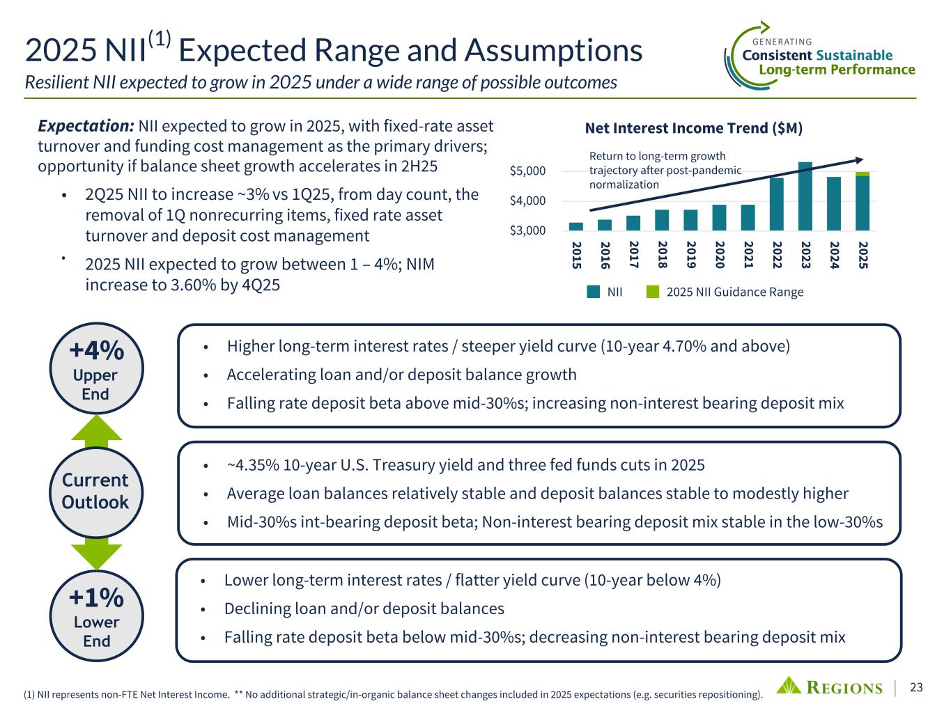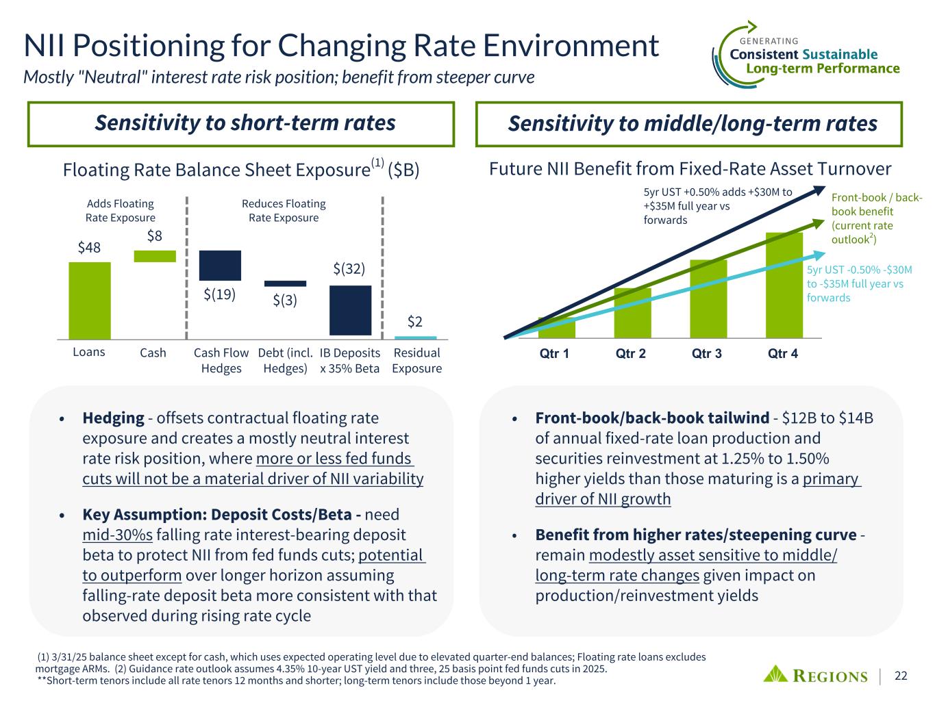 22 $48 $8 $(19) $(3) $2 • Front-book/back-book tailwind - $12B to $14B of annual fixed-rate loan production and securities reinvestment at 1.25% to 1.50% higher yields than those maturing is a primary driver of NII growth • Benefit from higher rates/steepening curve - remain modestly asset sensitive to middle/ long-term rate changes given impact on production/reinvestment yields Qtr 1 Qtr 2 Qtr 3 Qtr 4 5yr UST +0.50% adds +$30M to +$35M full year vs forwards NII Positioning for Changing Rate Environment Mostly "Neutral" interest rate risk position; benefit from steeper curve Adds Floating Rate Exposure Reduces Floating Rate Exposure (1) 3/31/25 balance sheet except for cash, which uses expected operating level due to elevated quarter-end balances; Floating rate loans excludes mortgage ARMs. (2) Guidance rate outlook assumes 4.35% 10-year UST yield and three, 25 basis point fed funds cuts in 2025. **Short-term tenors include all rate tenors 12 months and shorter; long-term tenors include those beyond 1 year. Loans Cash $(32) Cash Flow Hedges Debt (incl. Hedges) IB Deposits x 35% Beta Residual Exposure Front-book / back- book benefit (current rate outlook2) Floating Rate Balance Sheet Exposure(1) ($B) Future NII Benefit from Fixed-Rate Asset Turnover $(30) 5yr UST -0.50% -$30M to -$35M full year vs forwards Sensitivity to middle/long-term rates • Hedging - offsets contractual floating rate exposure and creates a mostly neutral interest rate risk position, where more or less fed funds cuts will not be a material driver of NII variability • Key Assumption: Deposit Costs/Beta - need mid-30%s falling rate interest-bearing deposit beta to protect NII from fed funds cuts; potential to outperform over longer horizon assuming falling-rate deposit beta more consistent with that observed during rising rate cycle Sensitivity to short-term rates