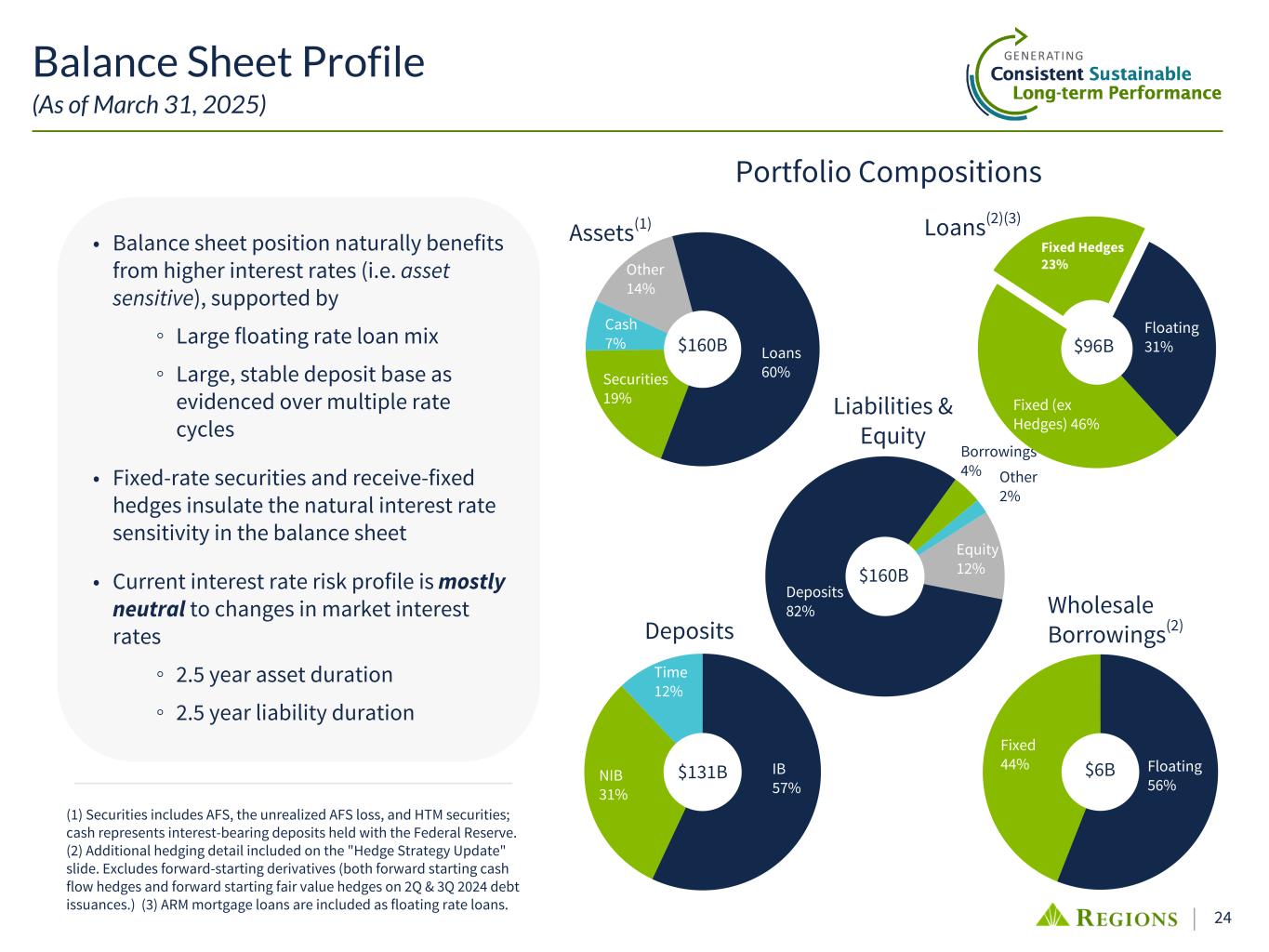 24 • Balance sheet position naturally benefits from higher interest rates (i.e. asset sensitive), supported by ◦ Large floating rate loan mix ◦ Large, stable deposit base as evidenced over multiple rate cycles • Fixed-rate securities and receive-fixed hedges insulate the natural interest rate sensitivity in the balance sheet • Current interest rate risk profile is mostly neutral to changes in market interest rates ◦ 2.5 year asset duration ◦ 2.5 year liability duration Floating 56% Fixed 44% Deposits 82% Borrowings 4% Other 2% Equity 12% IB 57% NIB 31% Time 12% Loans 60%Securities 19% Cash 7% Other 14% Floating 31% Fixed (ex Hedges) 46% Fixed Hedges 23% $131B Loans(2)(3) $96B Balance Sheet Profile (As of March 31, 2025) Portfolio Compositions $160B Assets(1) Liabilities & Equity $160B Wholesale Borrowings(2) $6B Deposits (1) Securities includes AFS, the unrealized AFS loss, and HTM securities; cash represents interest-bearing deposits held with the Federal Reserve. (2) Additional hedging detail included on the "Hedge Strategy Update" slide. Excludes forward-starting derivatives (both forward starting cash flow hedges and forward starting fair value hedges on 2Q & 3Q 2024 debt issuances.) (3) ARM mortgage loans are included as floating rate loans.