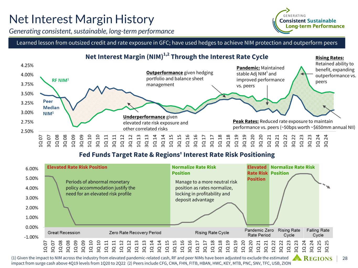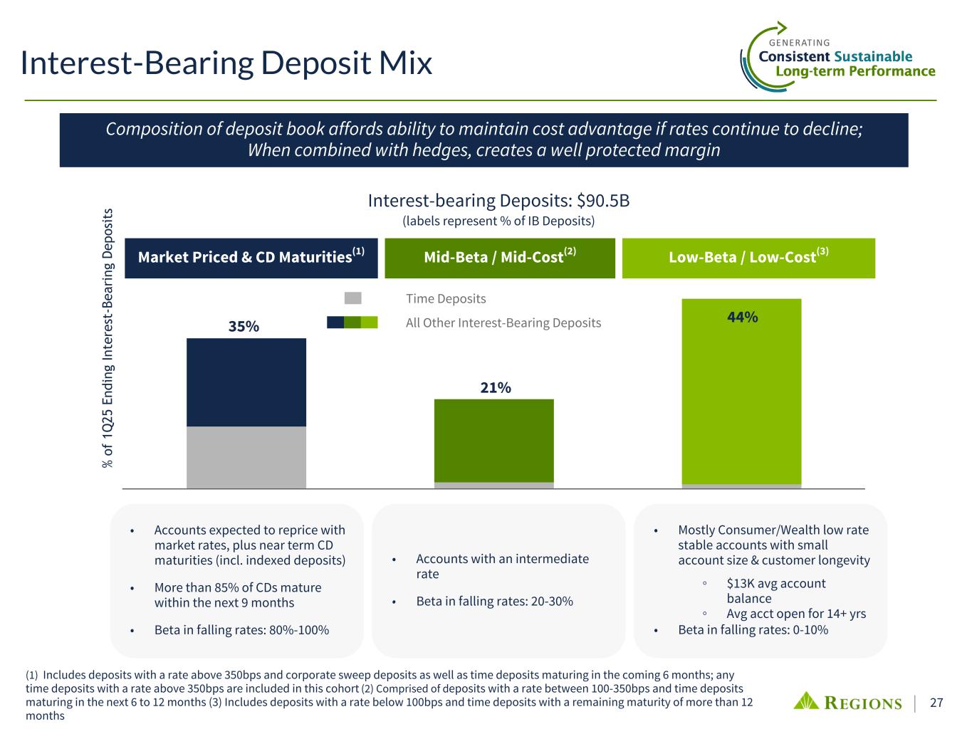 26 2.50% 5.43% 4.50% 0.82% 2.02%1.03% 2.96% 2.48% Fed Funds RF IB Deposit Cost Peer Median 1Q17 3Q17 1Q18 3Q18 1Q19 3Q19 1Q20 3Q20 1Q21 3Q21 1Q22 3Q22 1Q23 3Q23 1Q24 3Q24 1Q25 . —% 1.00% 2.00% 3.00% 4.00% 5.00% 6.00% 59% 35% 55% 55% 29% 43% Peer Median RF '04-'07 Cycle '15-'19 Cycle '21-'24 Cycle 0% 25% 50% 75% (1) Peers include CFG, CMA, FHN, FITB, HBAN, HWC, KEY, MTB, PNC, SNV, TFC, USB, ZION (2) Retail CD maturities as of 3/31/2025; balances do not include future rollover Interest-bearing Deposit Costs vs. Peers(1) Full Rising Rate Cycle Interest-bearing Deposit Betas In t- Be ar in g De po si t R at es Regions' Deposit Pricing Deposit Pricing Outperformance Expected to Persist • Regions' deposit composition has led to repricing (betas) among the lowest in the peer group through multiple rising rate cycles • Consistent rate seeking behavior across the last two cycles; higher full cycle beta in '21-'24 driven by magnitude of Fed tightening and duration of tightening cycle • Ability to reprice deposits lower with market rate declines, consistent with mid-30% performance to-date and amount necessary to protect NII; ability to outperform over time as CDs mature and reprice lower 2.34% $5.1 $3.2 $2.1 $0.9 $0.5 4.2% 3.5% 3.8% 3.0% 2.9% Volume $B Rate 2Q25 3Q25 4Q25 1Q26 2Q26 Retail CD Maturities (as of 3/31/2025)(2)