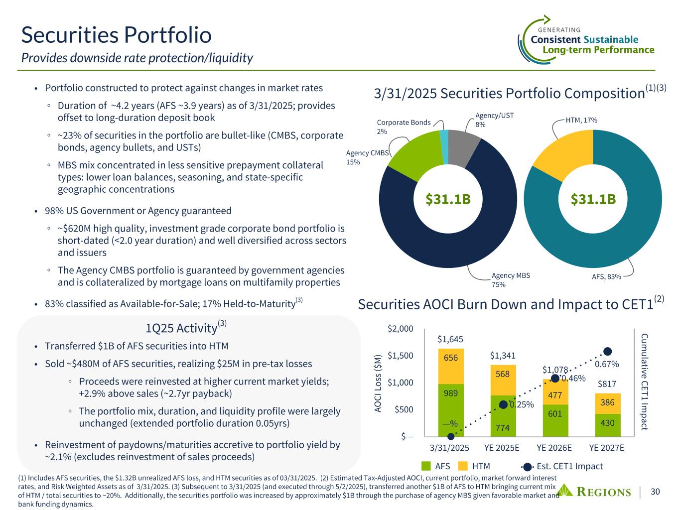 30 • Portfolio constructed to protect against changes in market rates ◦ Duration of ~4.2 years (AFS ~3.9 years) as of 3/31/2025; provides offset to long-duration deposit book ◦ ~23% of securities in the portfolio are bullet-like (CMBS, corporate bonds, agency bullets, and USTs) ◦ MBS mix concentrated in less sensitive prepayment collateral types: lower loan balances, seasoning, and state-specific geographic concentrations • 98% US Government or Agency guaranteed ◦ ~$620M high quality, investment grade corporate bond portfolio is short-dated (<2.0 year duration) and well diversified across sectors and issuers ◦ The Agency CMBS portfolio is guaranteed by government agencies and is collateralized by mortgage loans on multifamily properties • 83% classified as Available-for-Sale; 17% Held-to-Maturity(3) • Transferred $1B of AFS securities into HTM • Sold ~$480M of AFS securities, realizing $25M in pre-tax losses ◦ Proceeds were reinvested at higher current market yields; +2.9% above sales (~2.7yr payback) ◦ The portfolio mix, duration, and liquidity profile were largely unchanged (extended portfolio duration 0.05yrs) • Reinvestment of paydowns/maturities accretive to portfolio yield by ~2.1% (excludes reinvestment of sales proceeds) Agency/UST 8% Agency MBS 75% Agency CMBS 15% Corporate Bonds 2% Securities Portfolio Provides downside rate protection/liquidity 3/31/2025 Securities Portfolio Composition(1)(3) $31.1B Securities AOCI Burn Down and Impact to CET1(2) AO CI L os s ( $M ) Cum ulative CET1 Im pact 989 774 601 430 656 568 477 386 $1,645 $1,341 $1,078 $817 —% 0.25% 0.46% 0.67% AFS HTM Est. CET1 Impact 3/31/2025 YE 2025E YE 2026E YE 2027E $— $500 $1,000 $1,500 $2,0001Q25 Activity(3) AFS, 83% HTM, 17% (1) Includes AFS securities, the $1.32B unrealized AFS loss, and HTM securities as of 03/31/2025. (2) Estimated Tax-Adjusted AOCI, current portfolio, market forward interest rates, and Risk Weighted Assets as of 3/31/2025. (3) Subsequent to 3/31/2025 (and executed through 5/2/2025), transferred another $1B of AFS to HTM bringing current mix of HTM / total securities to ~20%. Additionally, the securities portfolio was increased by approximately $1B through the purchase of agency MBS given favorable market and bank funding dynamics. $31.1B