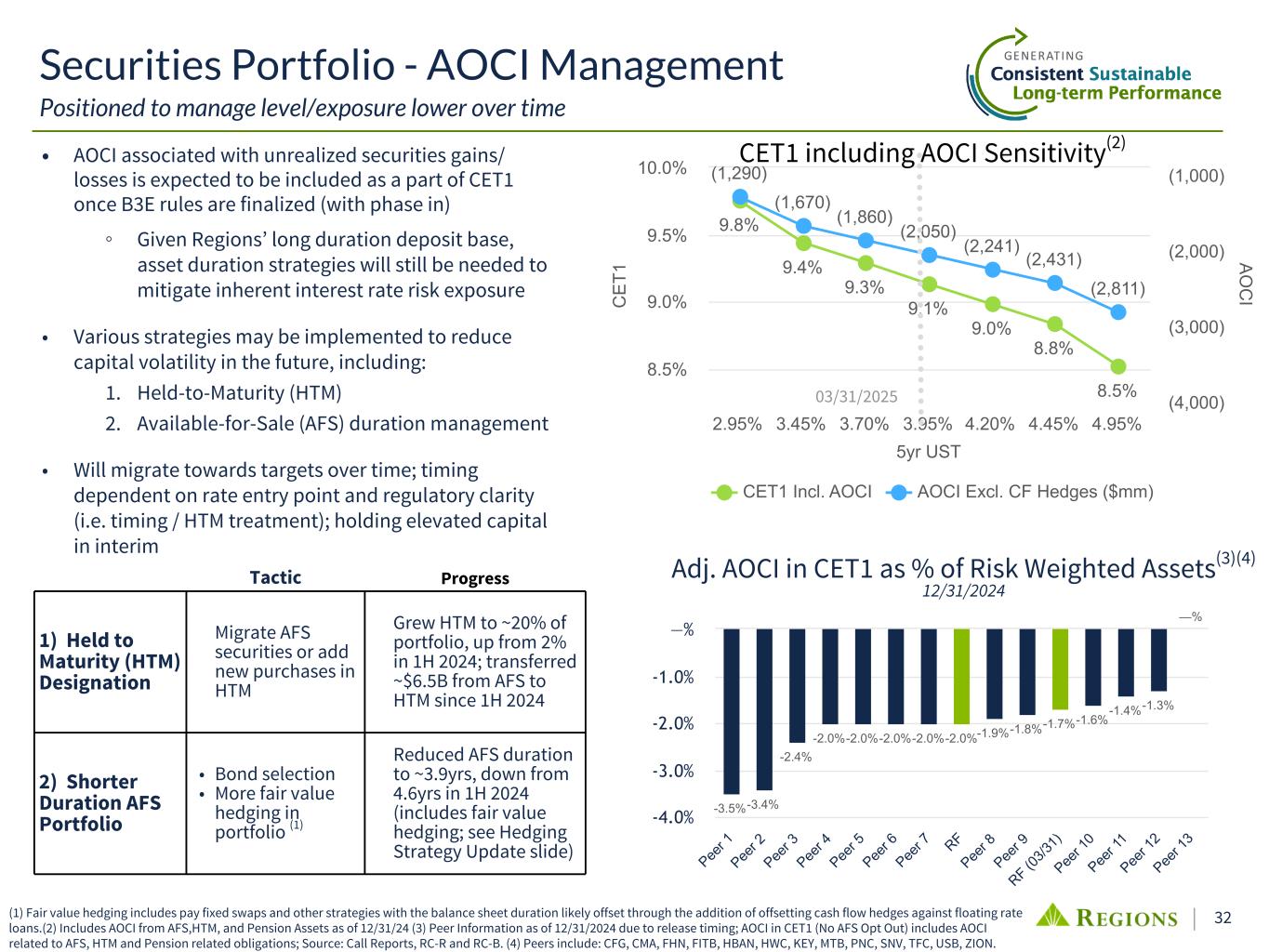 32 • AOCI associated with unrealized securities gains/ losses is expected to be included as a part of CET1 once B3E rules are finalized (with phase in) ◦ Given Regions’ long duration deposit base, asset duration strategies will still be needed to mitigate inherent interest rate risk exposure • Various strategies may be implemented to reduce capital volatility in the future, including: 1. Held-to-Maturity (HTM) 2. Available-for-Sale (AFS) duration management • Will migrate towards targets over time; timing dependent on rate entry point and regulatory clarity (i.e. timing / HTM treatment); holding elevated capital in interim (1) Fair value hedging includes pay fixed swaps and other strategies with the balance sheet duration likely offset through the addition of offsetting cash flow hedges against floating rate loans.(2) Includes AOCI from AFS,HTM, and Pension Assets as of 12/31/24 (3) Peer Information as of 12/31/2024 due to release timing; AOCI in CET1 (No AFS Opt Out) includes AOCI related to AFS, HTM and Pension related obligations; Source: Call Reports, RC-R and RC-B. (4) Peers include: CFG, CMA, FHN, FITB, HBAN, HWC, KEY, MTB, PNC, SNV, TFC, USB, ZION. Securities Portfolio - AOCI Management Positioned to manage level/exposure lower over time -3.5%-3.4% -2.4% -2.0%-2.0%-2.0%-2.0%-2.0%-1.9%-1.8%-1.7%-1.6% -1.4%-1.3% —% Pee r 1 Pee r 2 Pee r 3 Pee r 4 Pee r 5 Pee r 6 Pee r 7 RF Pee r 8 Pee r 9 RF (0 3/3 1) Pee r 1 0 Pee r 1 1 Pee r 1 2 Pee r 1 3 -4.0% -3.0% -2.0% -1.0% —% Adj. AOCI in CET1 as % of Risk Weighted Assets(3)(4) 12/31/2024 Tactic Progress 1) Held to Maturity (HTM) Designation Migrate AFS securities or add new purchases in HTM Grew HTM to ~20% of portfolio, up from 2% in 1H 2024; transferred ~$6.5B from AFS to HTM since 1H 2024 2) Shorter Duration AFS Portfolio • Bond selection • More fair value hedging in portfolio (1) Reduced AFS duration to ~3.9yrs, down from 4.6yrs in 1H 2024 (includes fair value hedging; see Hedging Strategy Update slide) 5yr UST C E T1 A O C I 9.8% 9.4% 9.3% 9.1% 9.0% 8.8% 8.5% (1,290) (1,670) (1,860) (2,050) (2,241) (2,431) (2,811) CET1 Incl. AOCI AOCI Excl. CF Hedges ($mm) 2.95% 3.45% 3.70% 3.95% 4.20% 4.45% 4.95% 8.5% 9.0% 9.5% 10.0% (4,000) (3,000) (2,000) (1,000) CET1 including AOCI Sensitivity(2) 03/31/2025