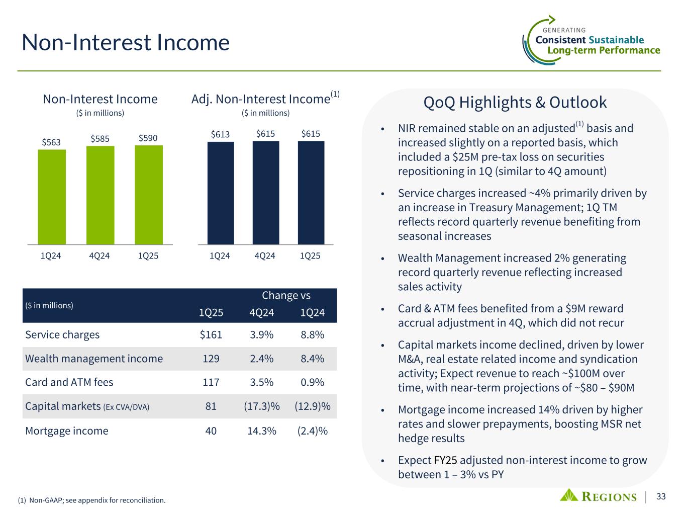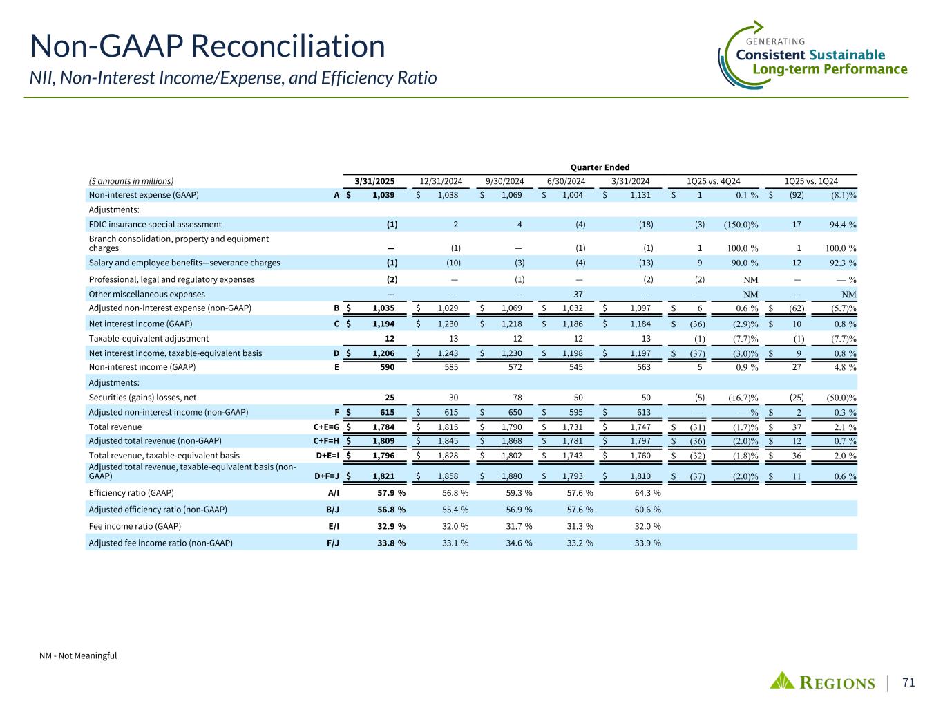 71 Non-GAAP Reconciliation NII, Non-Interest Income/Expense, and Efficiency Ratio NM - Not Meaningful Quarter Ended ($ amounts in millions) 3/31/2025 12/31/2024 9/30/2024 6/30/2024 3/31/2024 1Q25 vs. 4Q24 1Q25 vs. 1Q24 Non-interest expense (GAAP) A $ 1,039 $ 1,038 $ 1,069 $ 1,004 $ 1,131 $ 1 0.1 % $ (92) (8.1) % Adjustments: FDIC insurance special assessment (1) 2 4 (4) (18) (3) (150.0) % 17 94.4 % Branch consolidation, property and equipment charges — (1) — (1) (1) 1 100.0 % 1 100.0 % Salary and employee benefits—severance charges (1) (10) (3) (4) (13) 9 90.0 % 12 92.3 % Professional, legal and regulatory expenses (2) — (1) — (2) (2) NM — — % Other miscellaneous expenses — — — 37 — — NM — NM Adjusted non-interest expense (non-GAAP) B $ 1,035 $ 1,029 $ 1,069 $ 1,032 $ 1,097 $ 6 0.6 % $ (62) (5.7) % Net interest income (GAAP) C $ 1,194 $ 1,230 $ 1,218 $ 1,186 $ 1,184 $ (36) (2.9) % $ 10 0.8 % Taxable-equivalent adjustment 12 13 12 12 13 (1) (7.7) % (1) (7.7) % Net interest income, taxable-equivalent basis D $ 1,206 $ 1,243 $ 1,230 $ 1,198 $ 1,197 $ (37) (3.0) % $ 9 0.8 % Non-interest income (GAAP) E 590 585 572 545 563 5 0.9 % 27 4.8 % Adjustments: Securities (gains) losses, net 25 30 78 50 50 (5) (16.7) % (25) (50.0) % Adjusted non-interest income (non-GAAP) F $ 615 $ 615 $ 650 $ 595 $ 613 — — % $ 2 0.3 % Total revenue C+E=G $ 1,784 $ 1,815 $ 1,790 $ 1,731 $ 1,747 $ (31) (1.7) % $ 37 2.1 % Adjusted total revenue (non-GAAP) C+F=H $ 1,809 $ 1,845 $ 1,868 $ 1,781 $ 1,797 $ (36) (2.0) % $ 12 0.7 % Total revenue, taxable-equivalent basis D+E=I $ 1,796 $ 1,828 $ 1,802 $ 1,743 $ 1,760 $ (32) (1.8) % $ 36 2.0 % Adjusted total revenue, taxable-equivalent basis (non- GAAP) D+F=J $ 1,821 $ 1,858 $ 1,880 $ 1,793 $ 1,810 $ (37) (2.0) % $ 11 0.6 % Efficiency ratio (GAAP) A/I 57.9 % 56.8 % 59.3 % 57.6 % 64.3 % Adjusted efficiency ratio (non-GAAP) B/J 56.8 % 55.4 % 56.9 % 57.6 % 60.6 % Fee income ratio (GAAP) E/I 32.9 % 32.0 % 31.7 % 31.3 % 32.0 % Adjusted fee income ratio (non-GAAP) F/J 33.8 % 33.1 % 34.6 % 33.2 % 33.9 %